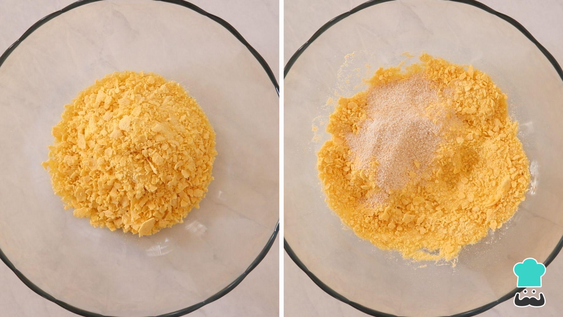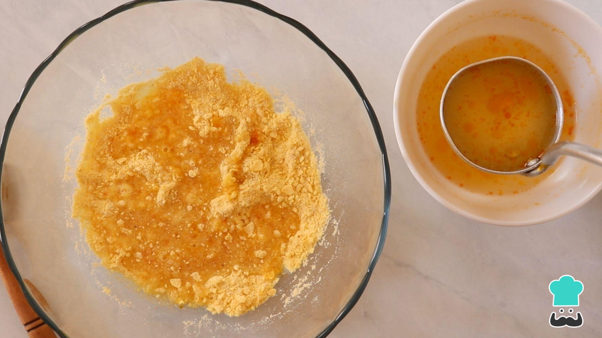 Caldo pronto? Então vamos para a massa do bolinho caipira. Em uma tigela acrescente a farinha de milho e quebre os pedacinhos com as mãos mesmo. Em seguida acrescente a farinha de mandioca e misture.