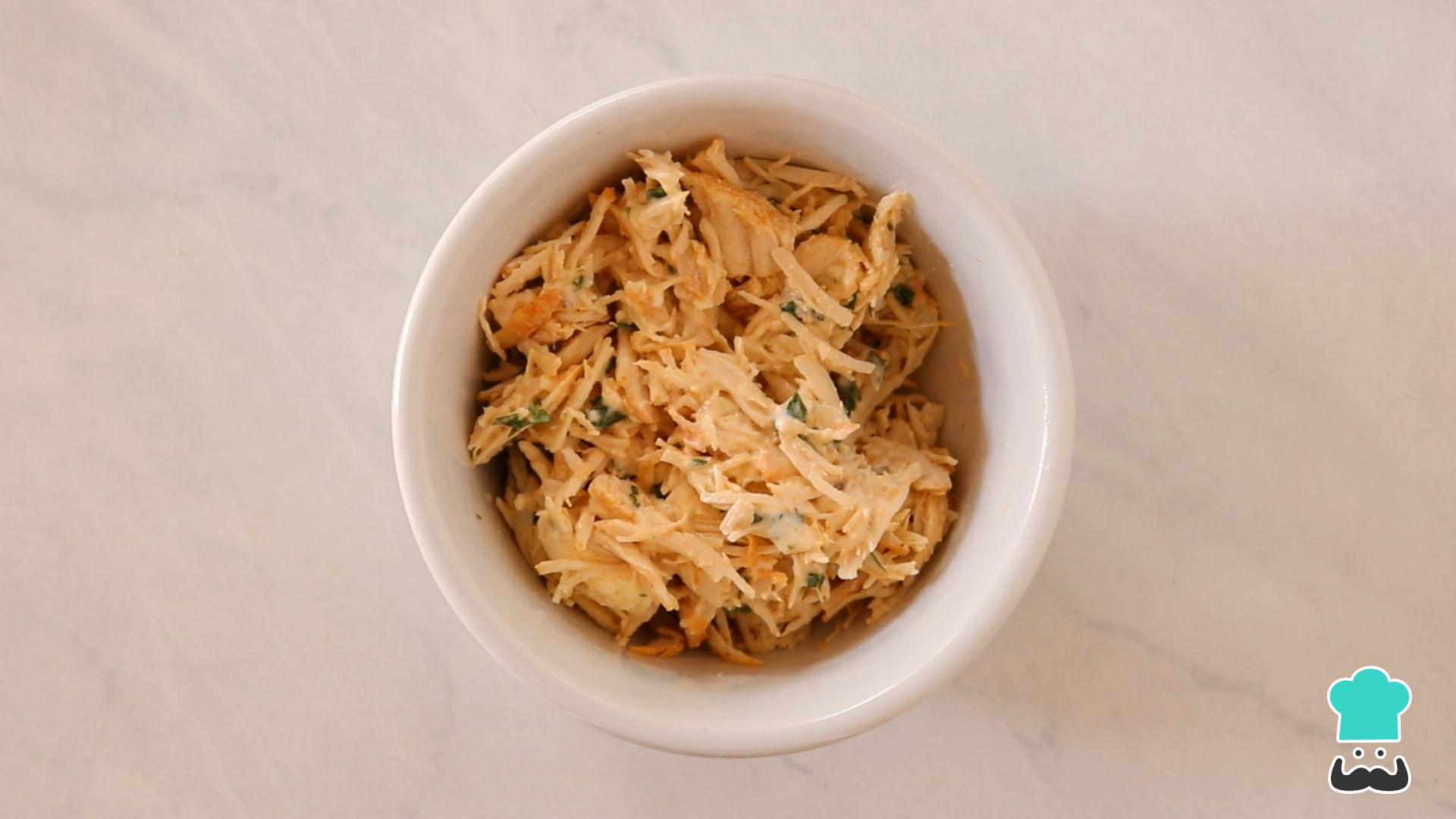 Agora traga o frango desfiado para bancada de novo e complemente esse recheio colocando 2 colheres de sopa de requeijão e salsa picada.