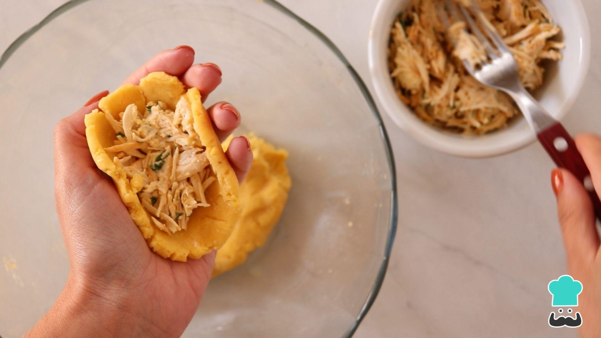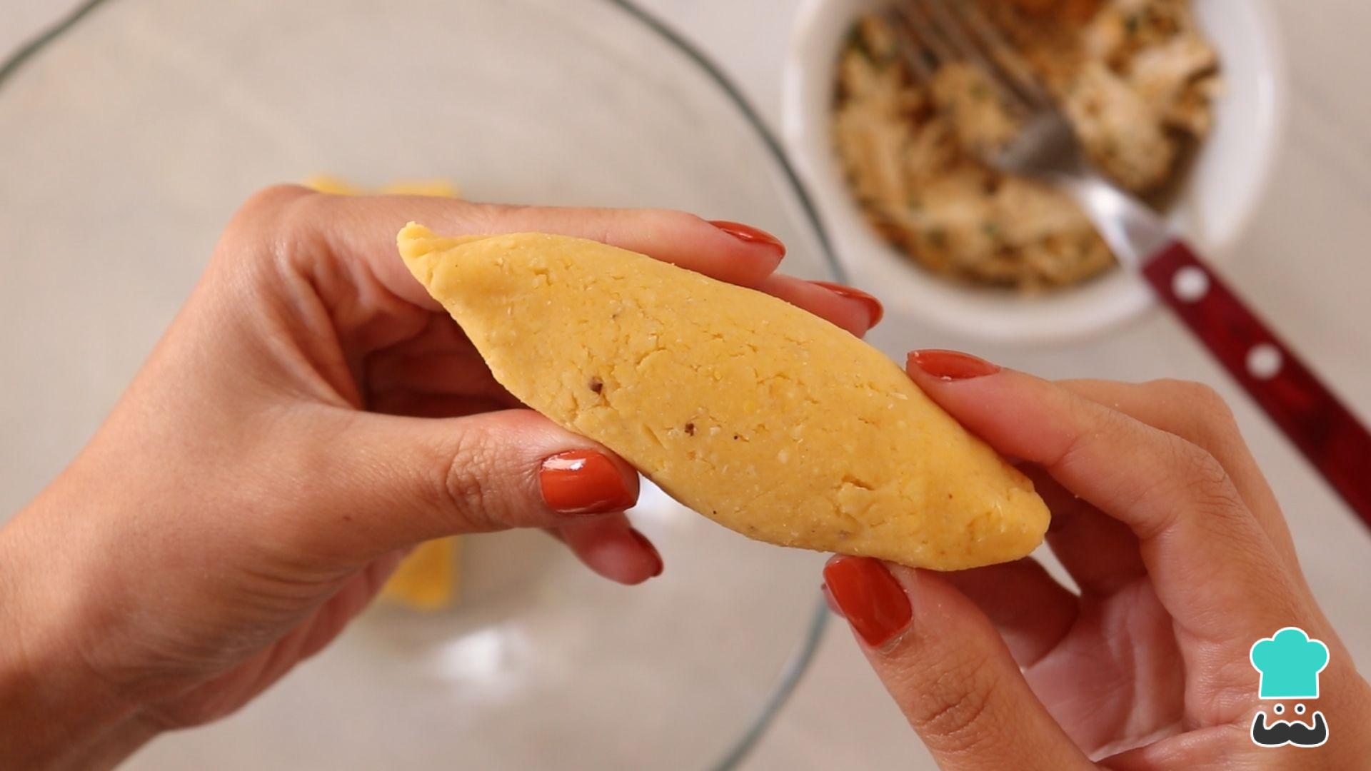 Pegue um pouco da massa e modele na palma da mão fazendo uma espécie de canoa. Coloque o recheio de frango.