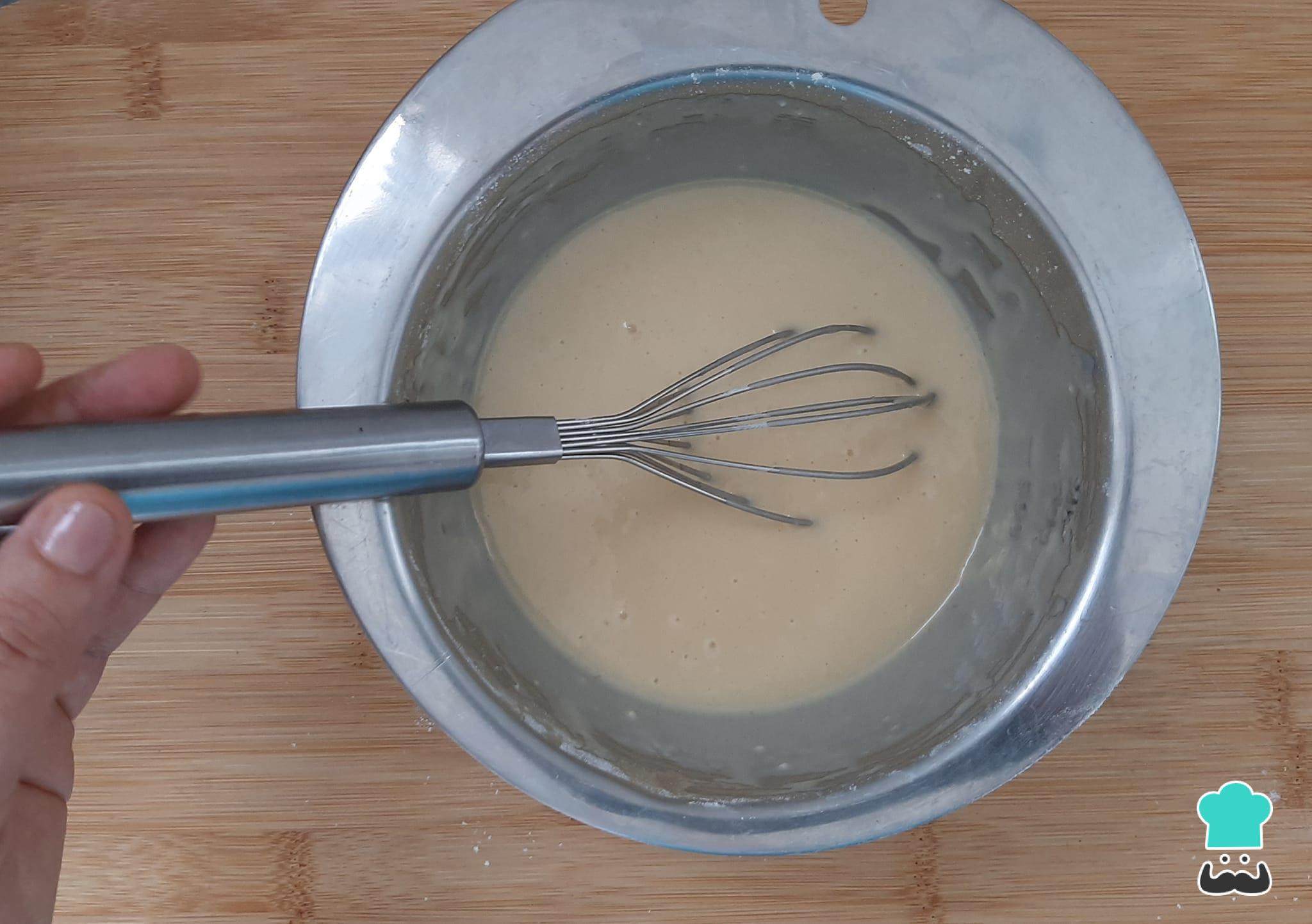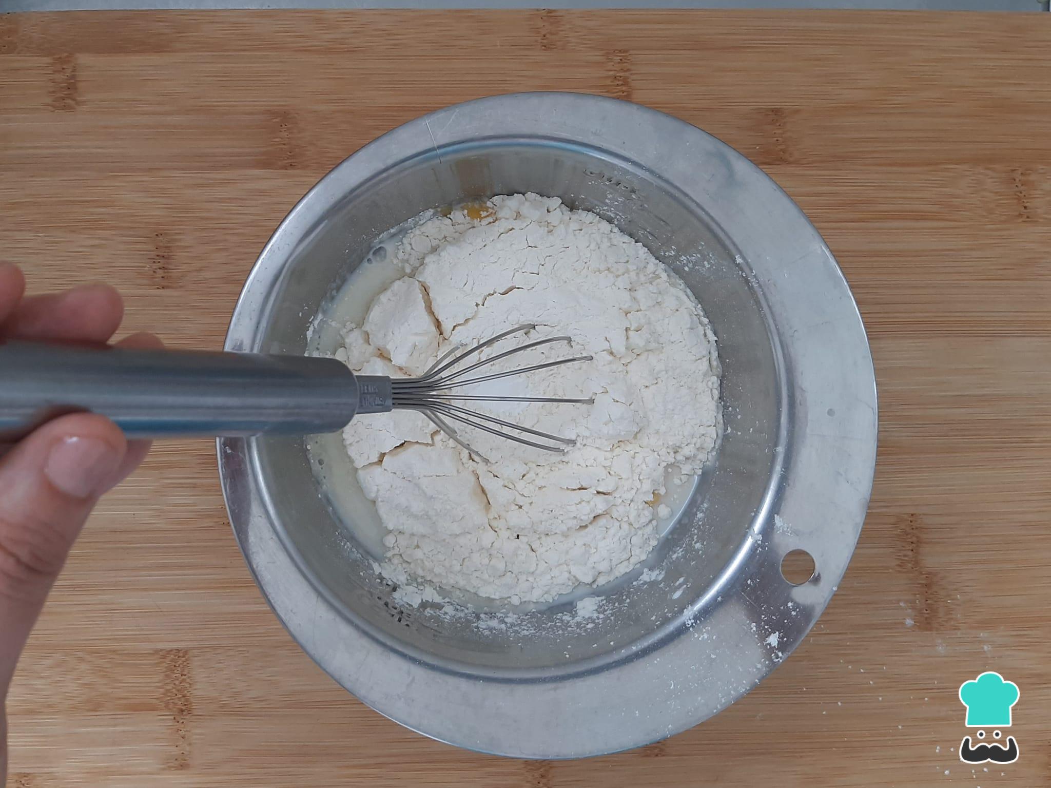 Adicione a farinha de trigo aos poucos e vá misturando até ficar homogêneo, de preferência com um batedor (como na foto).