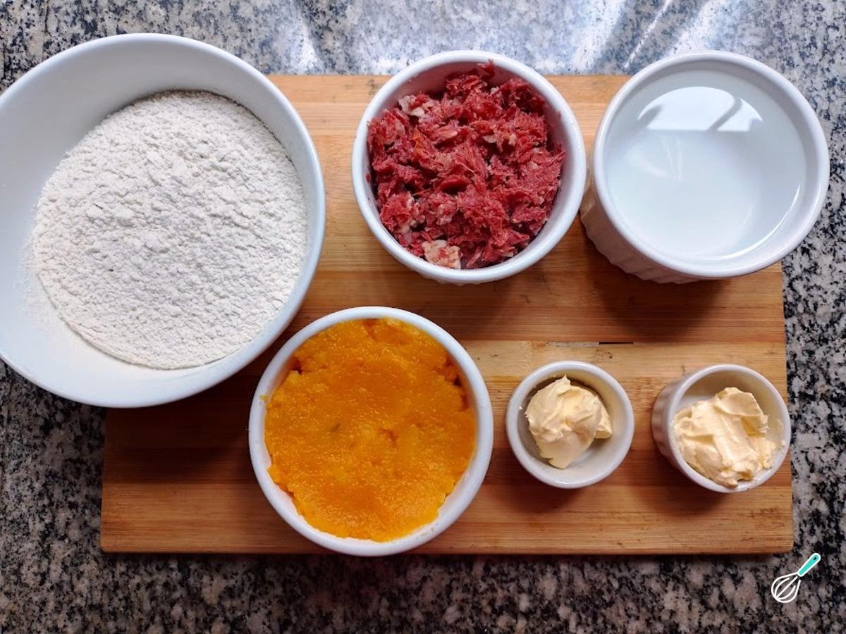 Comece por separar todos os ingredientes que serão utilizados na receita. Sendo que a abóbora deverá ser cozida com água e sal e, posteriormente, amassada até virar o purê. E a carne seca, deverá ser desalgada, cozida e refogada com alho, cebola e temperos a gosto.
