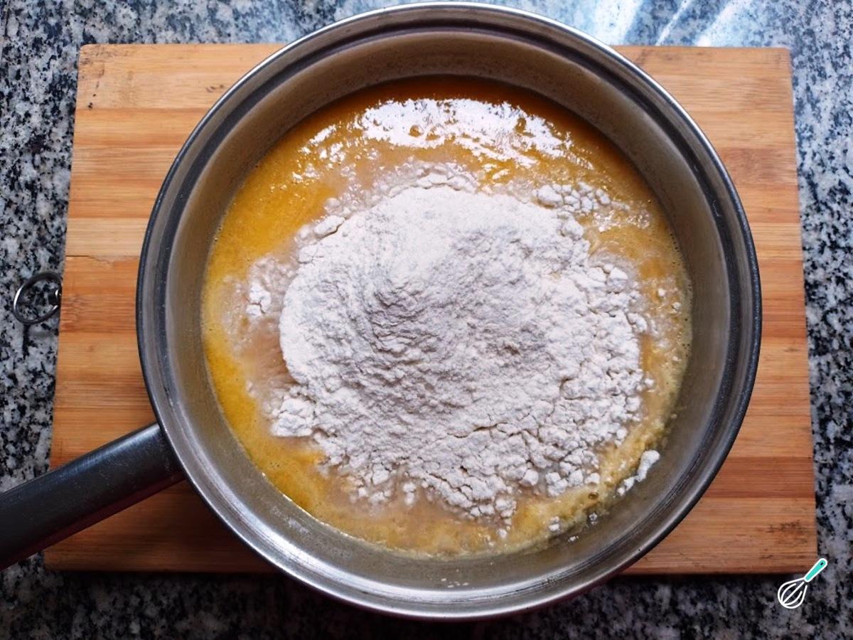 O próximo passo é colocar a farinha de trigo de uma vez. Misture até formar a massa e deixe cozinhar por alguns minutos;