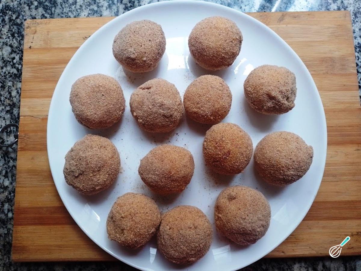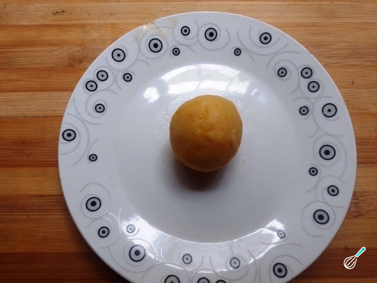 Depois que esfriar, porcione os bolinhos. Esta receita rende 12 bolinhos com 45 gramas cada um (somente de massa). Para rechear, faça um disco, coloque o recheio e depois feche, formando uma bolinha.