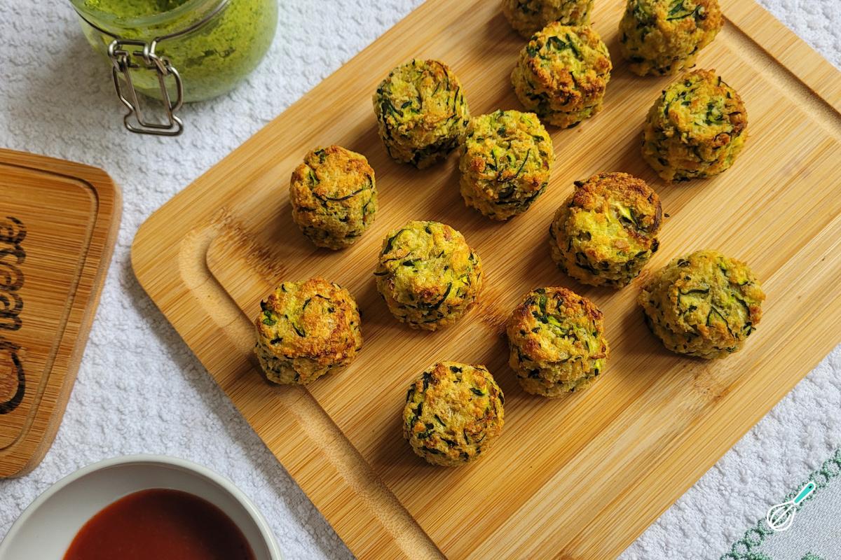 Seus bolinhos de abobrinha assados estão prontos para serem servidos. Ficam perfeitos para servir com um molhinho de lanche ou aperitivo, mas também ficam ótimos como acompanhamento de uma refeição.