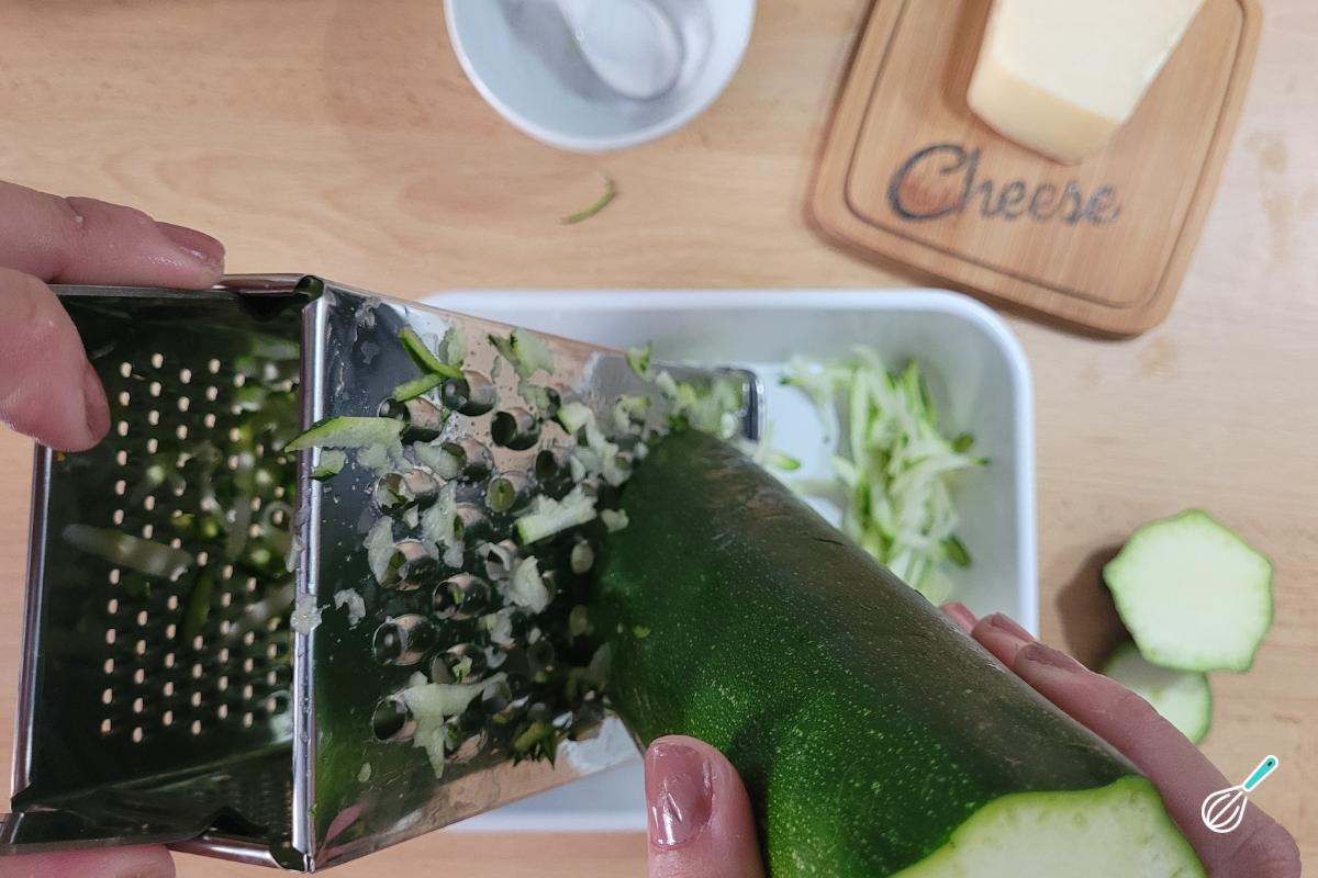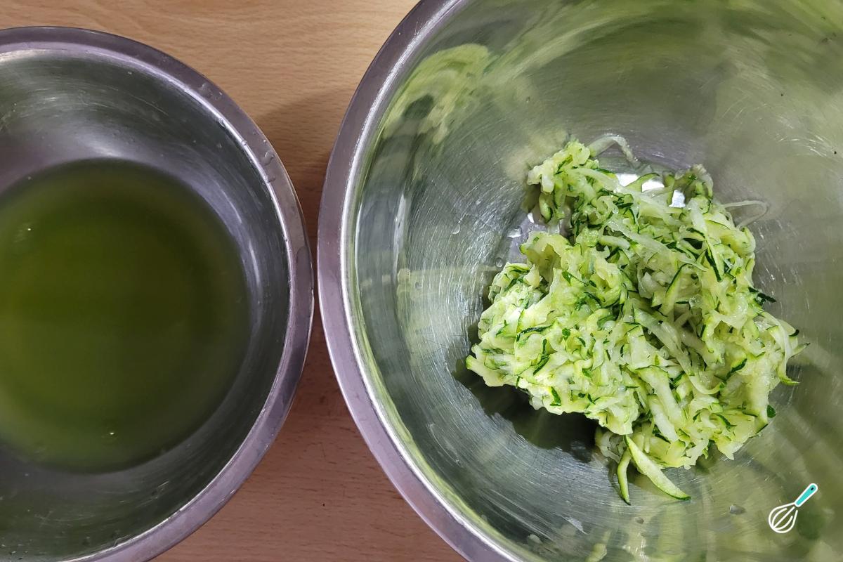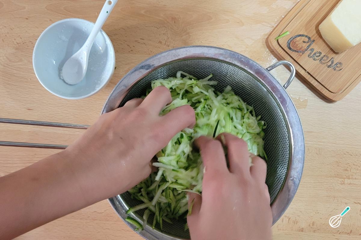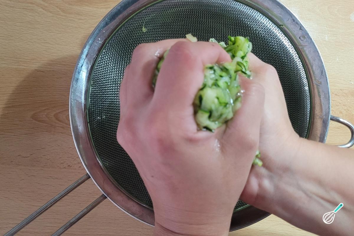 Após esse tempo, a abobrinha já terá soltado bastante água, mas esprema para tirar o excesso. Quanto mais água conseguir tirar, melhor. Se preferir, coloque a abobrinha ralada em um pano de prato limpo e esprema para facilitar.