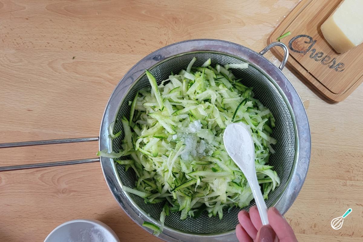 Coloque a abobrinha ralada sobre uma peneira com uma tigela por baixo e adicione o sal.