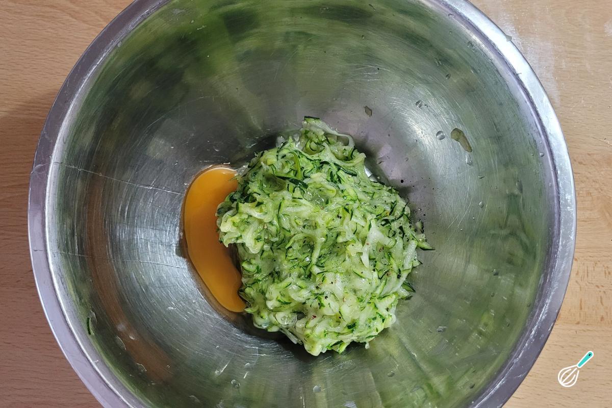 Tempere com pimenta do reino e adicione o ovo. Não coloquei sal porque já tinha usado bastante sal para tirar a água da abobrinha, mas você pode ajustar o sal e adicionar outros temperos que quiser, como cebola e alho em pó, orégano, páprica...