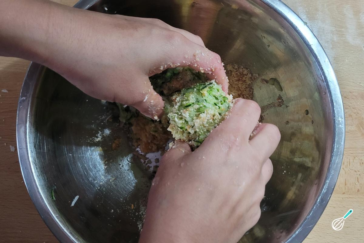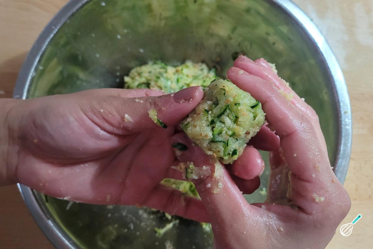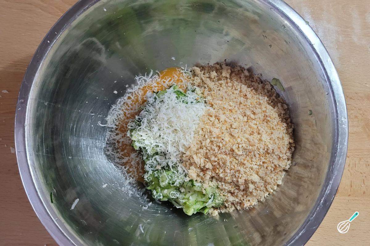 Misture bem para envolver e reserve por 15 a 20 minutos. Esse processo vai ajudar a soltar a água da abobrinha e é importante para que os bolinhos fiquem mais crocantes.