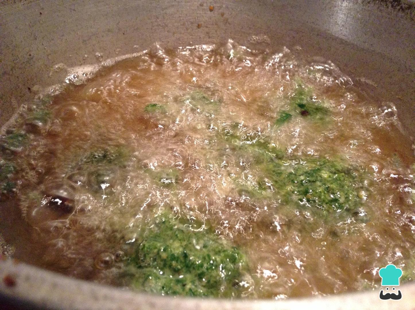 Leve uma frigideira com óleo ao fogo médio e, quando estiver quente, adicione porções da mistura com a ajuda de uma colher. Deixe fritar os bolinhos até que fiquem douradinhos e retire para um prato com papel absorvente.