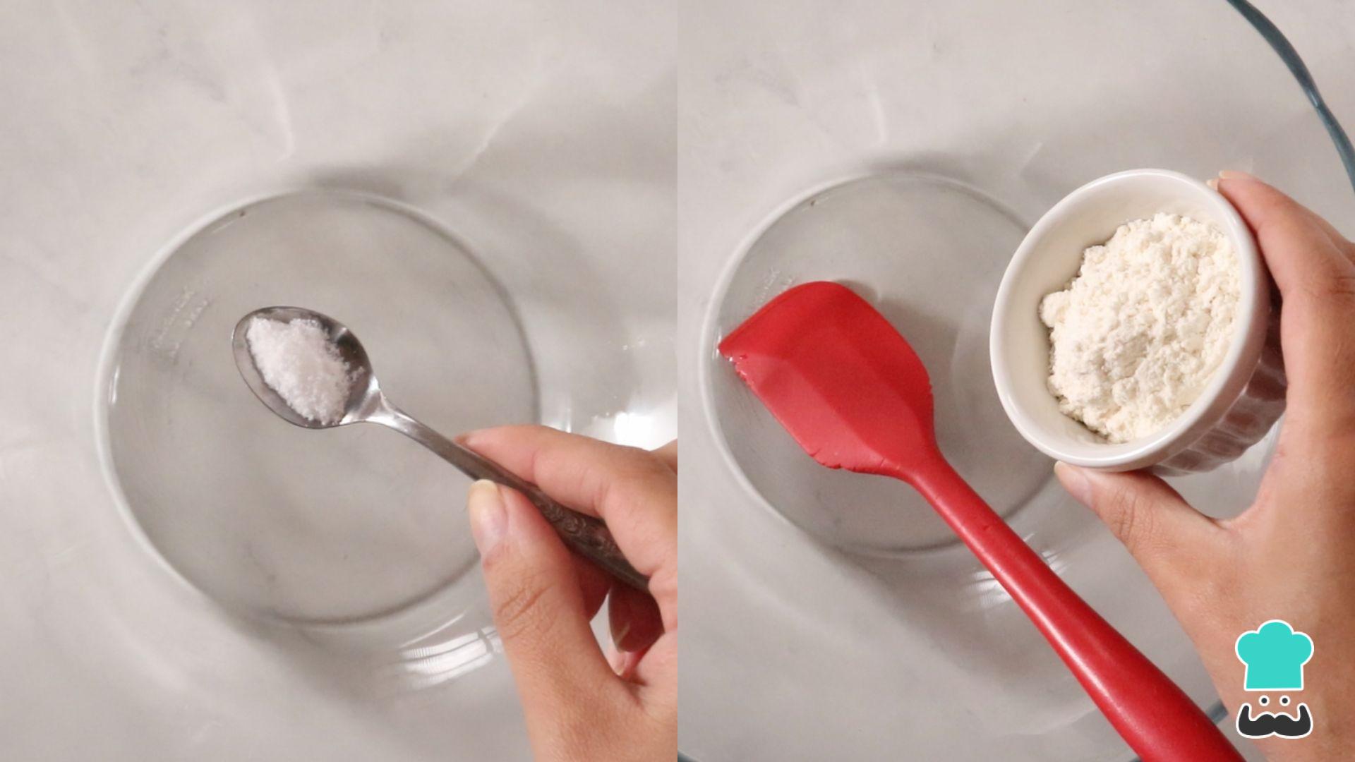 Em uma tigela despeje a água quente e dilua o sal. Em seguida junte a farinha de trigo.