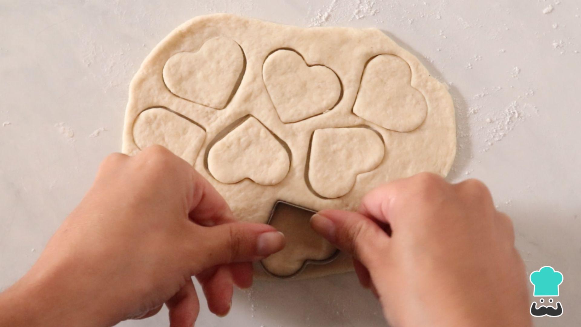 Abra a massa com um rolo e corte no formato e tamanho que preferir: aqui usei um cortador de biscoito em formato de coração.