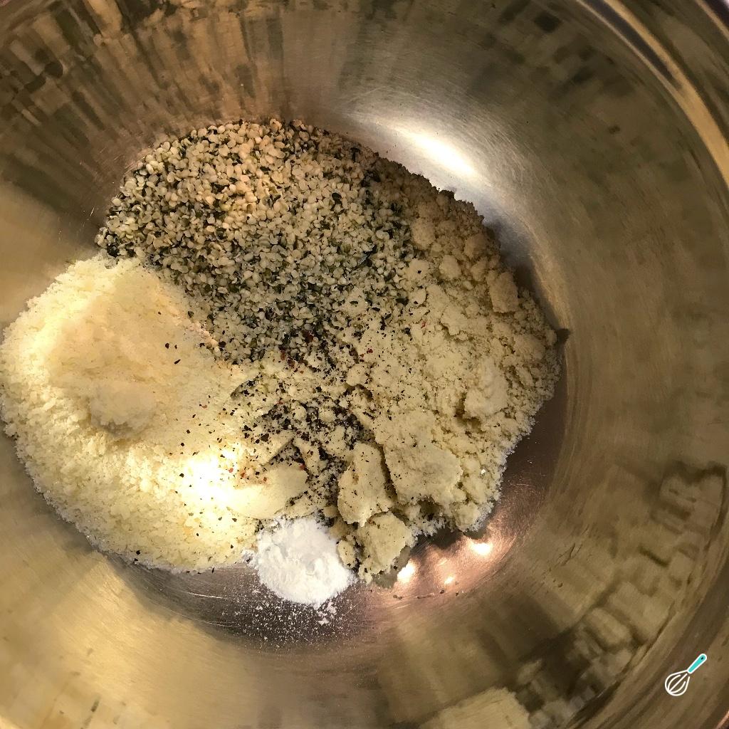 Comece seu muffin sem glúten de alho poró misturando os secos (farinha de amêndoas, fermento, semente de hemp, parmesão, farinha linhaça, sal, pimenta e ervas).