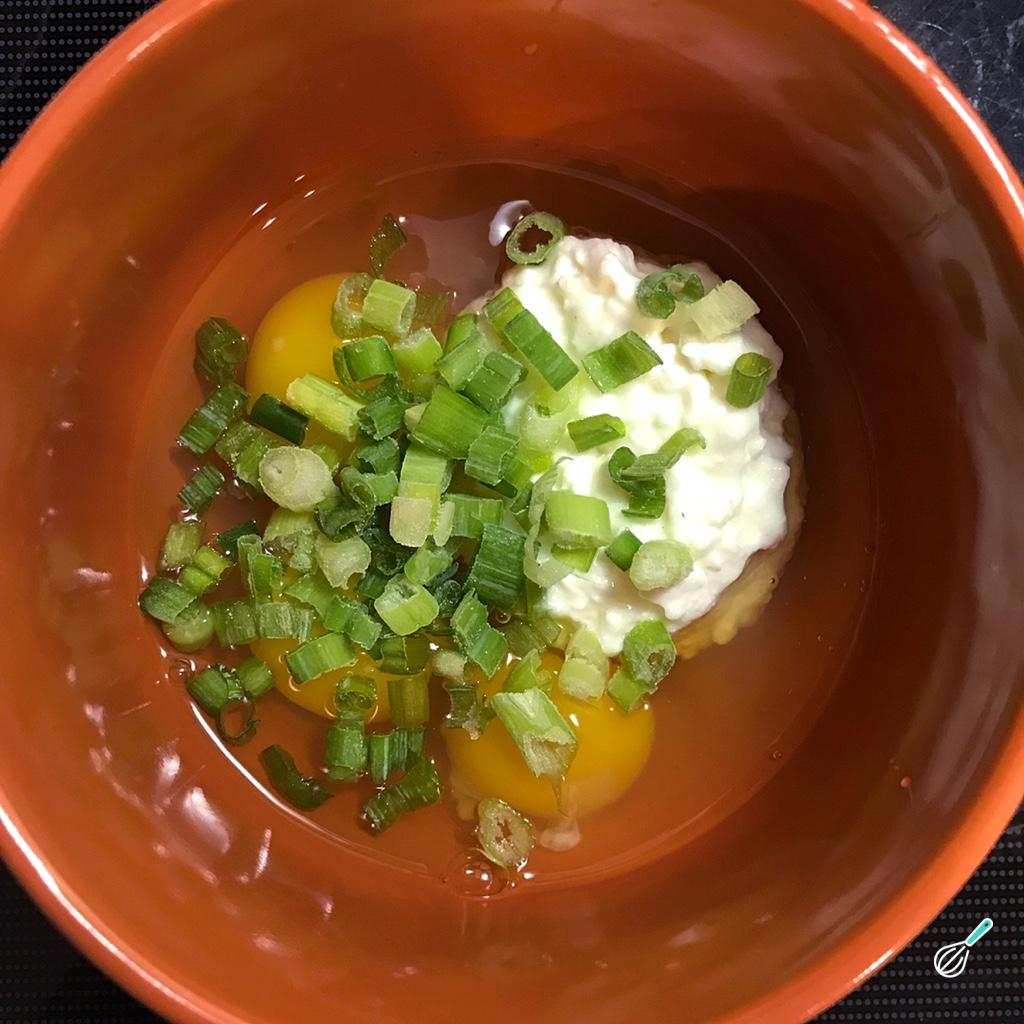 Em outra travessa misture os ovos com o queijo cottage e a cebolinha.