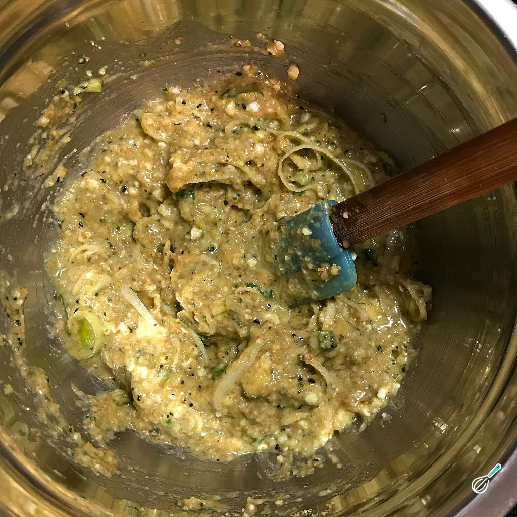 Junte os secos com os ovos e o alho poró e misture tudo muito bem.
