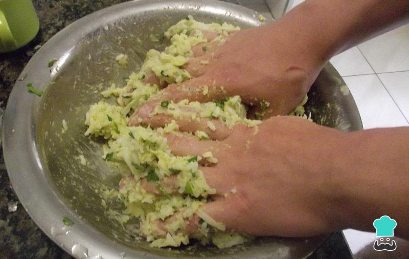 O primeiro passo da receita de bolinho de arroz consiste em bater os ovos, picar a cebola e misturar todos os ingredientes em uma tigela. Mexa bem, com uma colher ou com as mãos, até conseguir uma pasta.