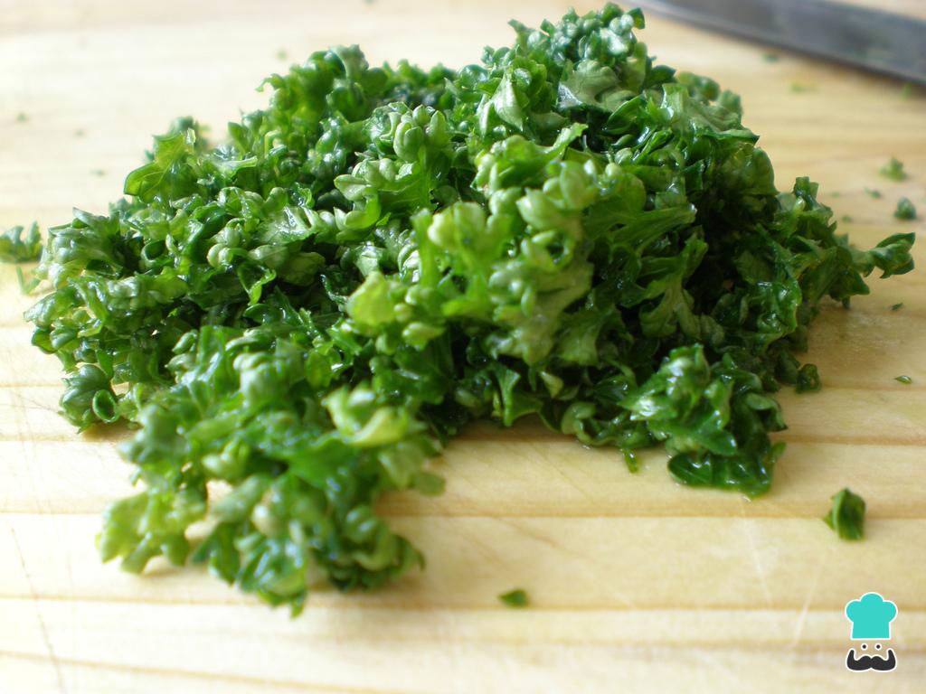 O primeiro passo para esta receita de bolinho de arroz assado é lavar e picar a salsinha. Reserve.