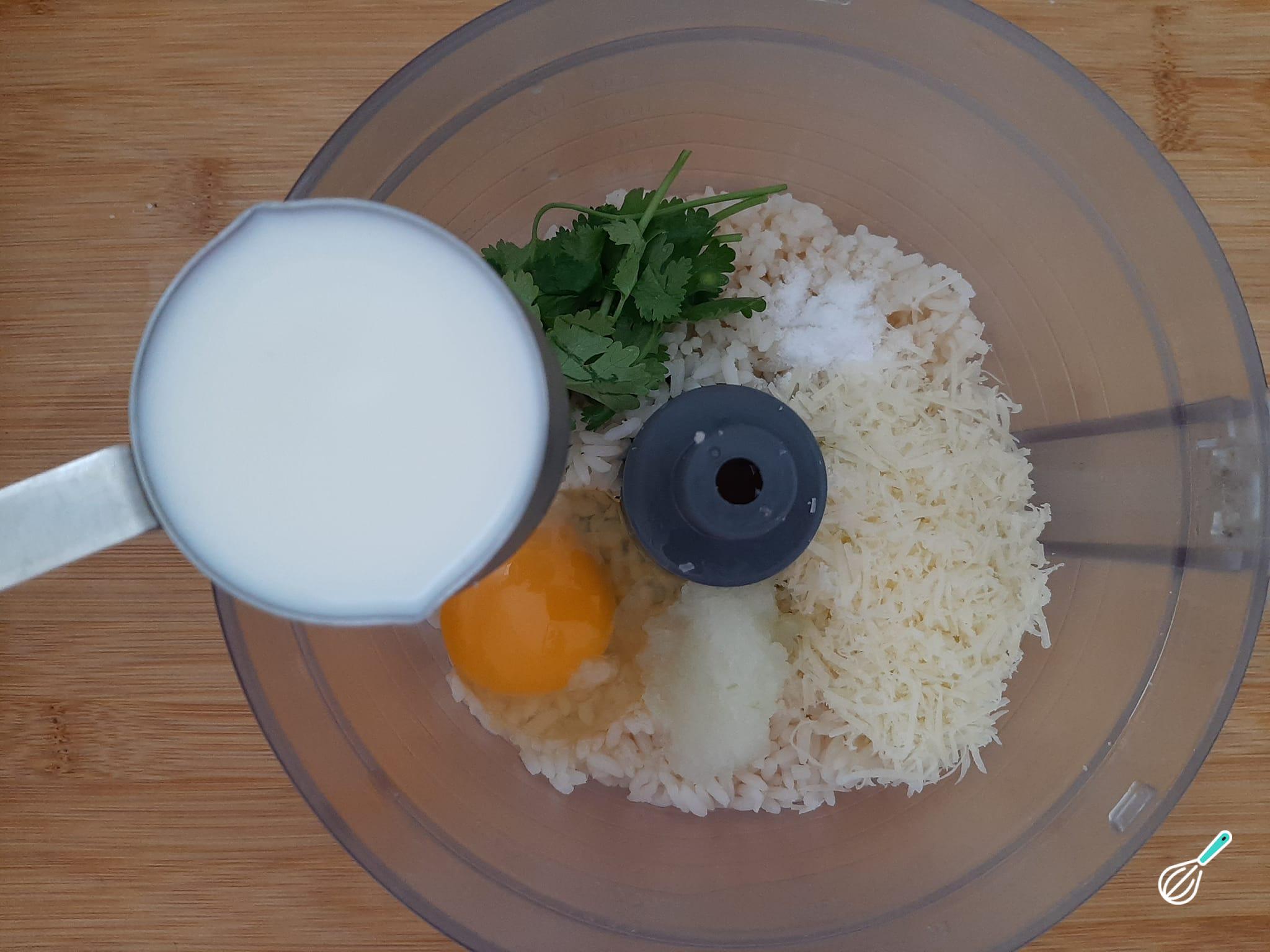 Num processador, misture o arroz, o ovo, o cheiro verde, a cebola e o leite.