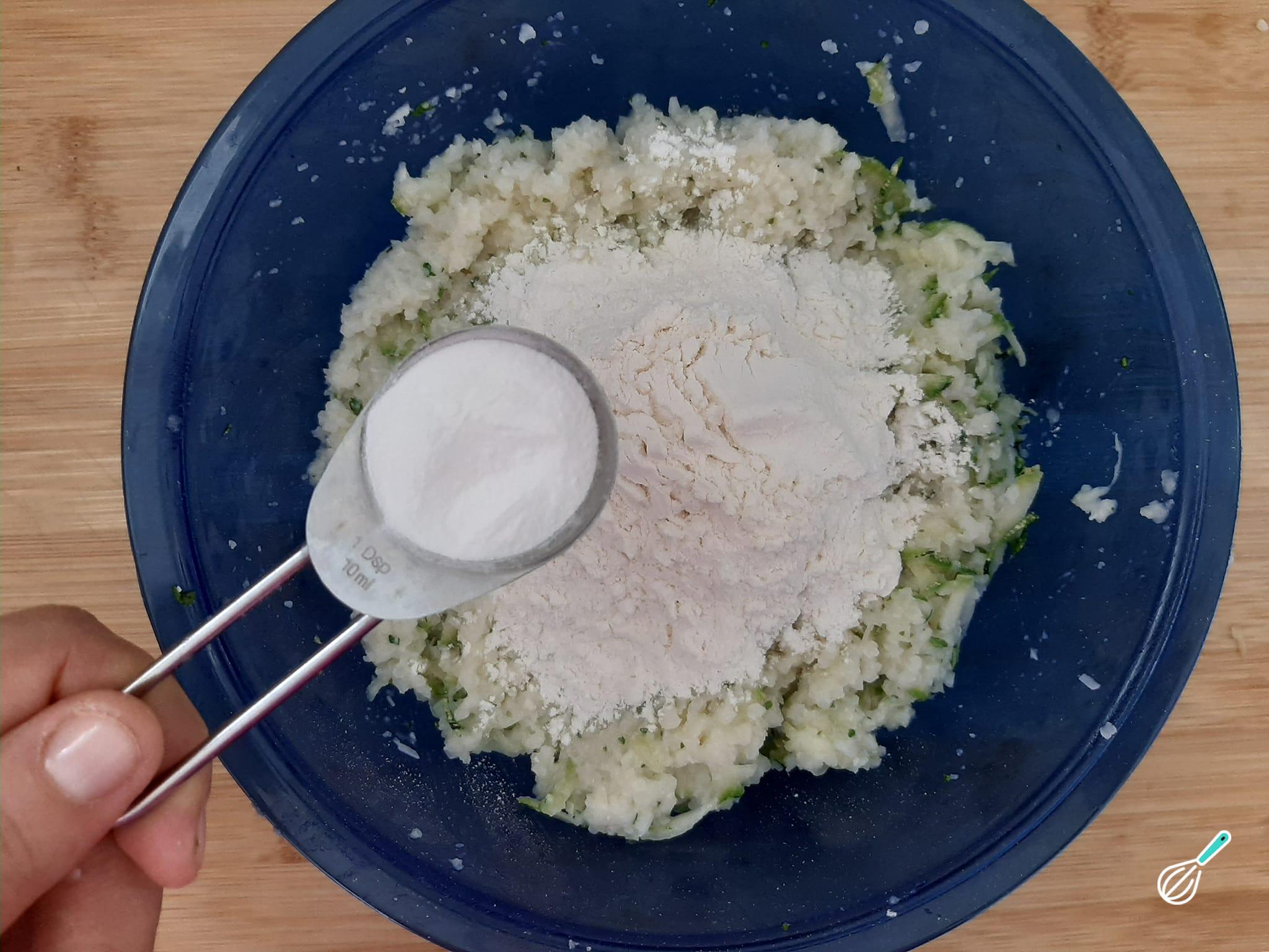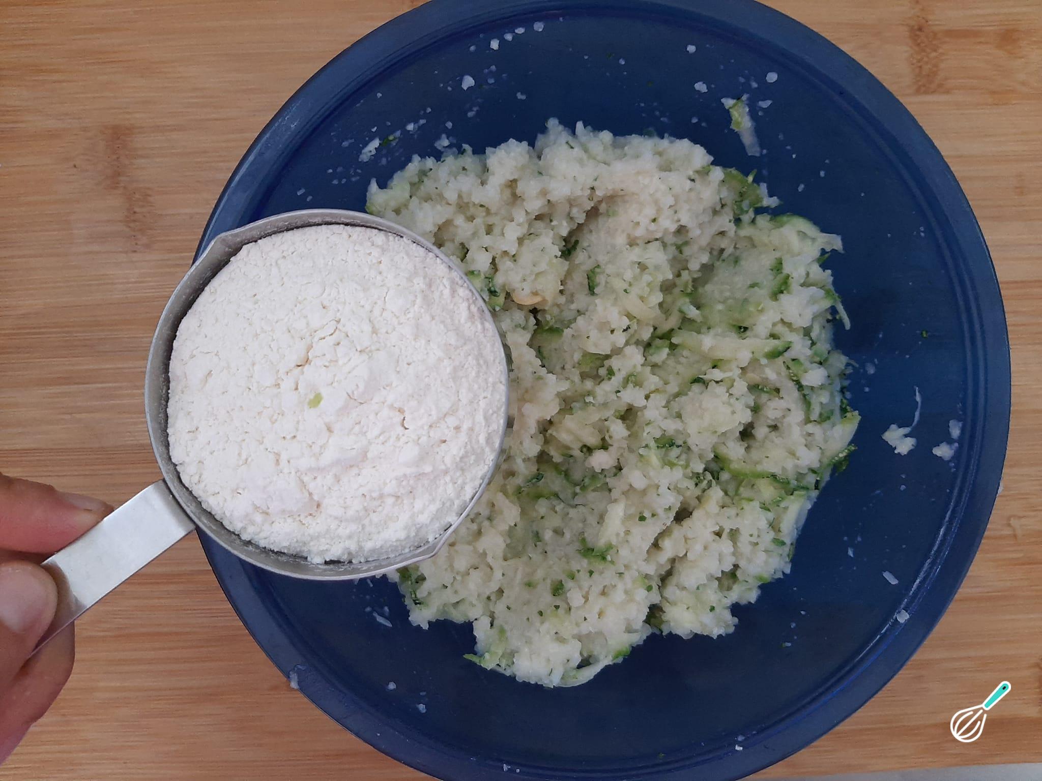 Junte os ingredientes processados com a abobrinha ralada, tempere com sal e pimenta-do-reino e adicione a farinha de trigo.