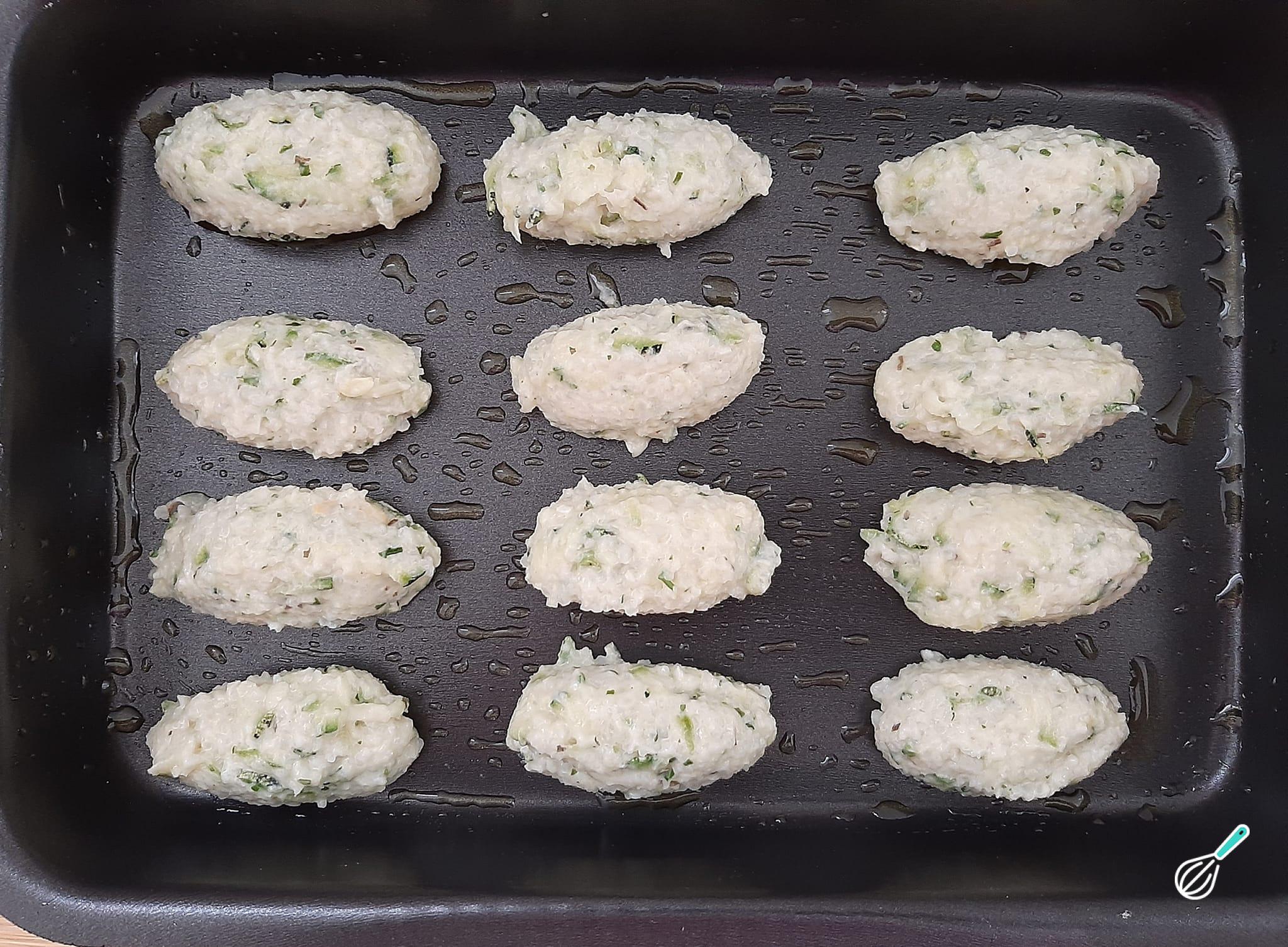 Forme bolinhas com a massa, utilizando 2 colheres de sobremesa (para modelar em formato oval) e acomode-as numa assadeira untada com azeite de oliva, dando espaço entre elas. Leve para assar no forno a 180 graus pelo mesmo tempo informado acima.