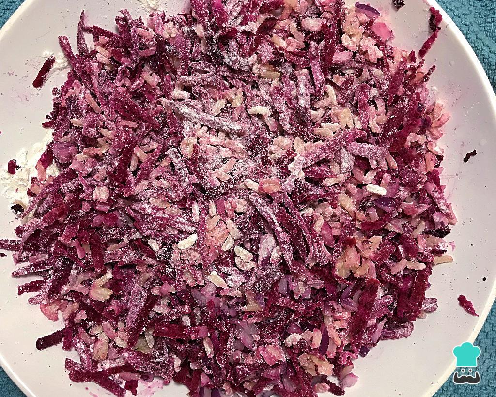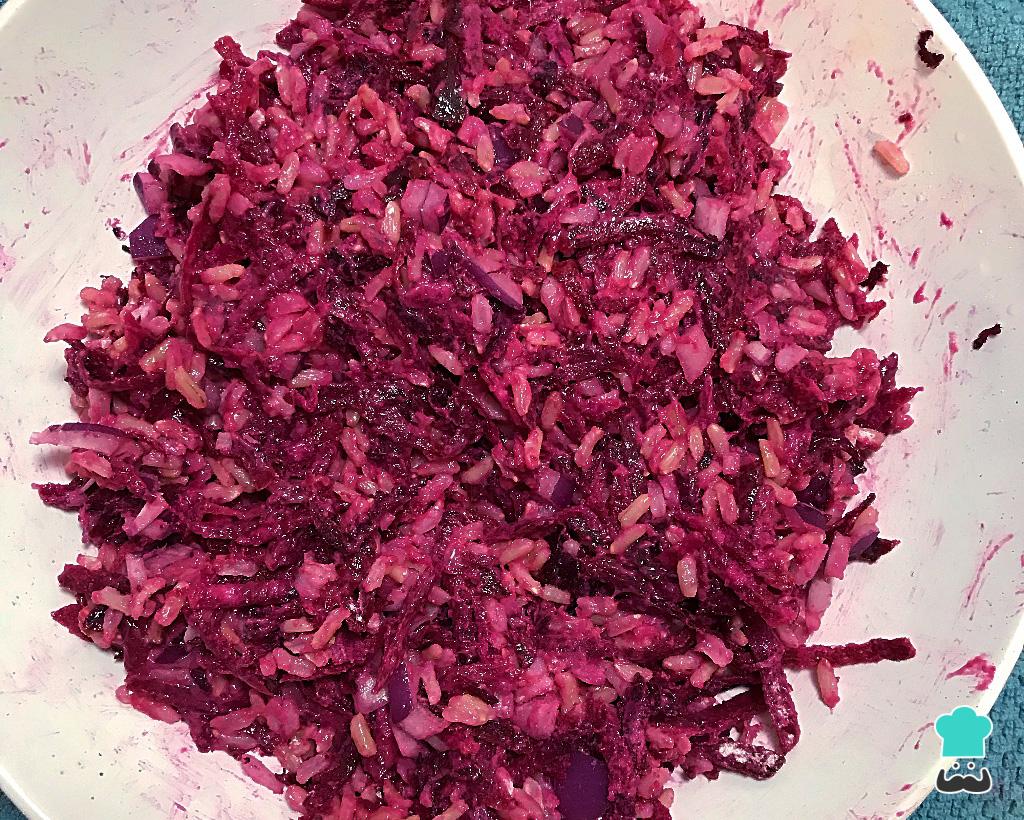 Comece misturando os secos: a beterraba, o arroz, a cebola roxa, o sal, a pimenta e a farinha sem glúten.