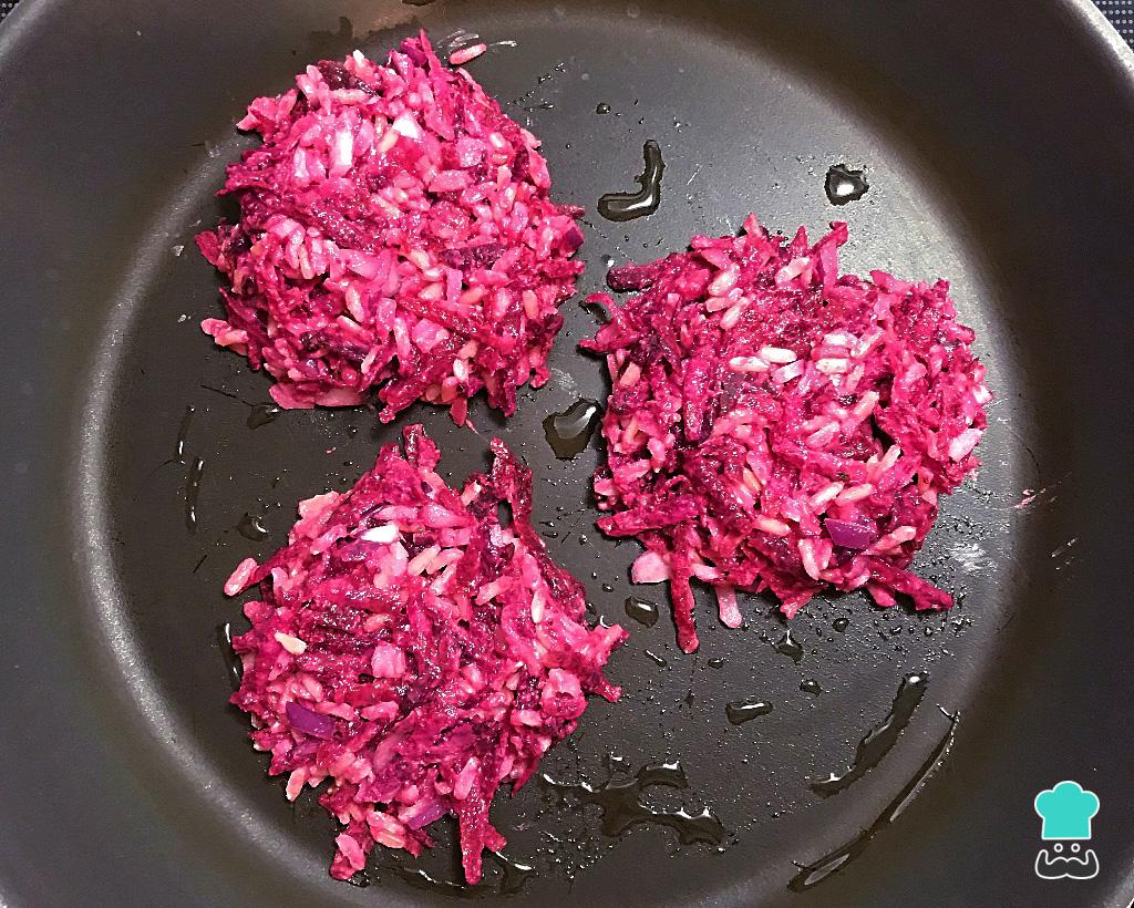 Unte uma frigideira com um pouco de óleo de coco e coloque colheradas dessa massa rosa mais linda da vida! Frite por mais ou menos 3 minutos de cada lado, até ficar crocante.
