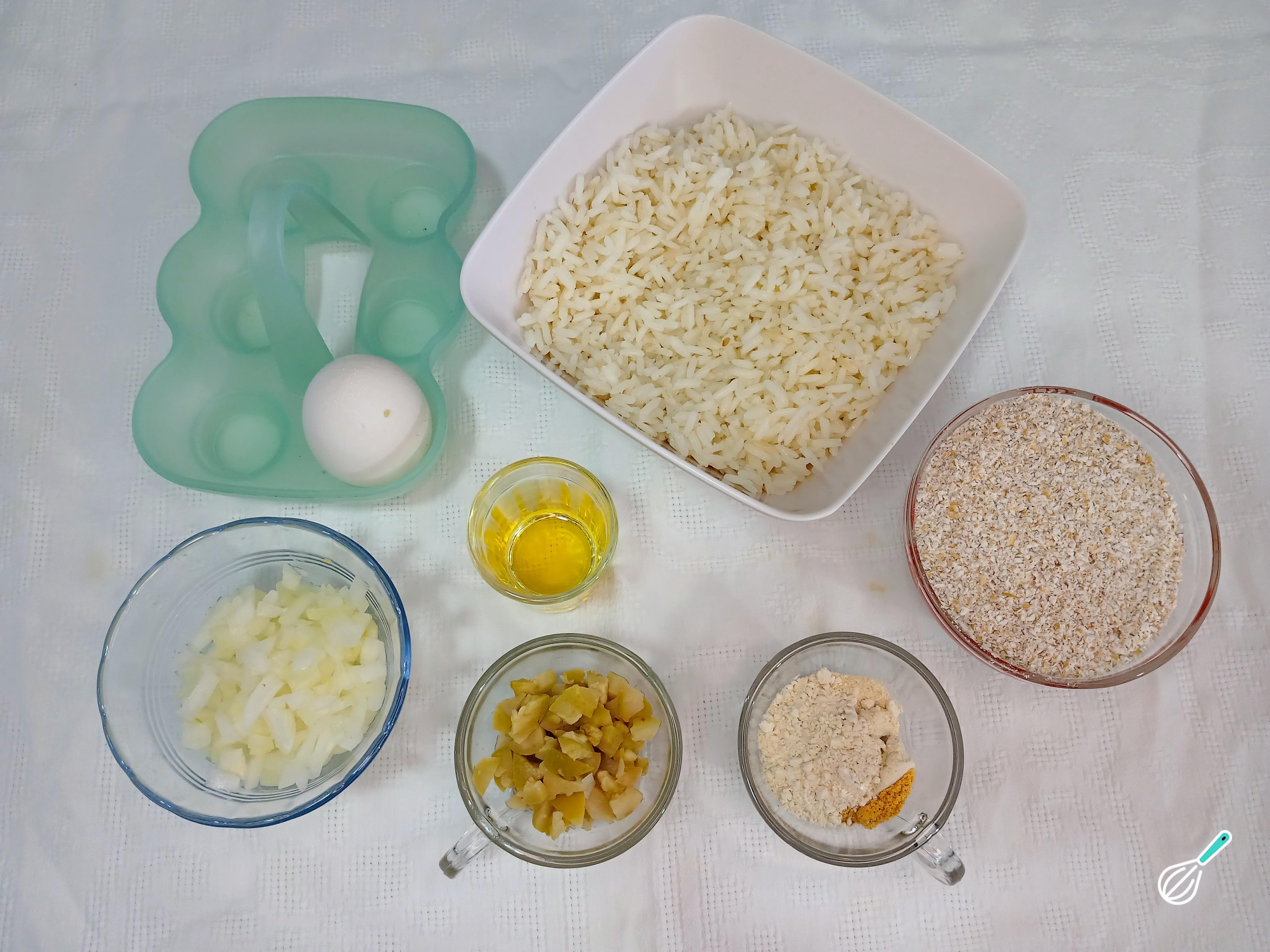 Comece separando os ingredientes para o preparo do bolinho de arroz com farinha de aveia. Separe o arroz já cozido, a farinha de aveia, o sal, os temperos como alho e cebola em pó, páprica doce, temperos mistos e azeitonas. Separe também as as farinhas de aveia e de arroz.