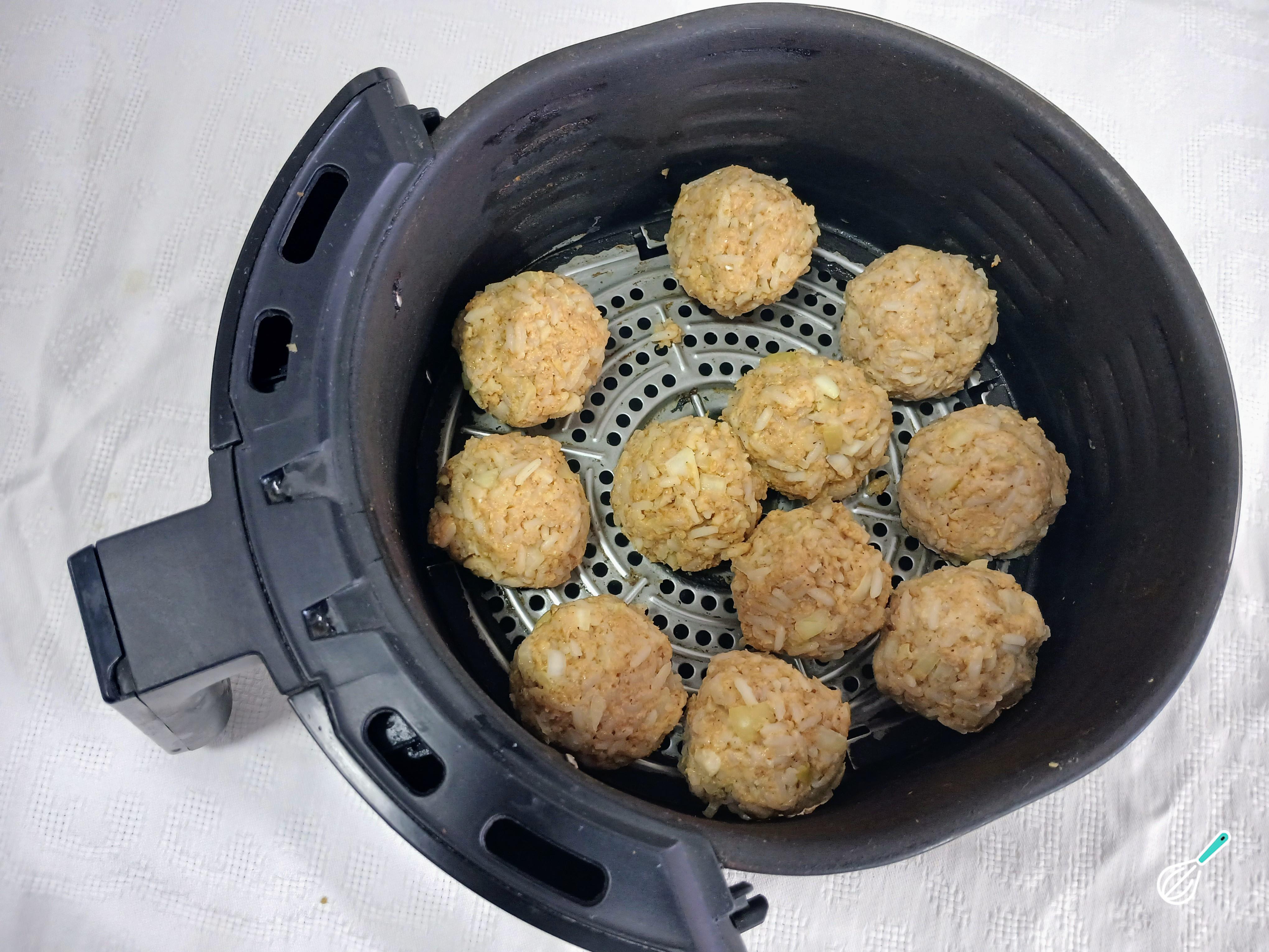 Feito isso, modele os bolinhos e coloque-os no cesto da air fryer. Pincele um pouco de azeite e leve para assar a 180 graus por 20 a 25 minutos.