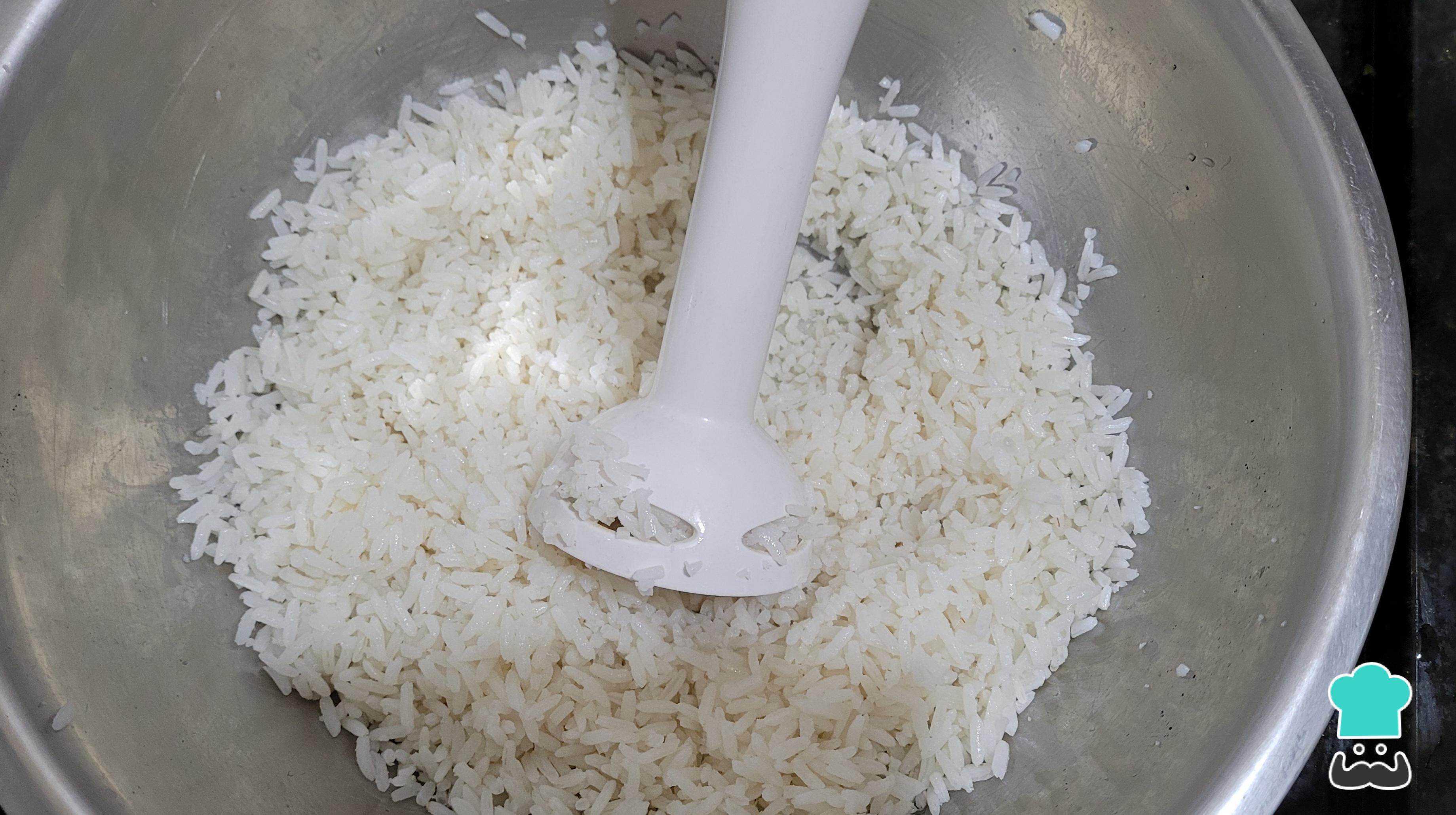 Vamos começar a preparar o bolinho de arroz? Coloque o arroz cozido em um recipiente e utilize o mixer para deixá-los em grãos menores.