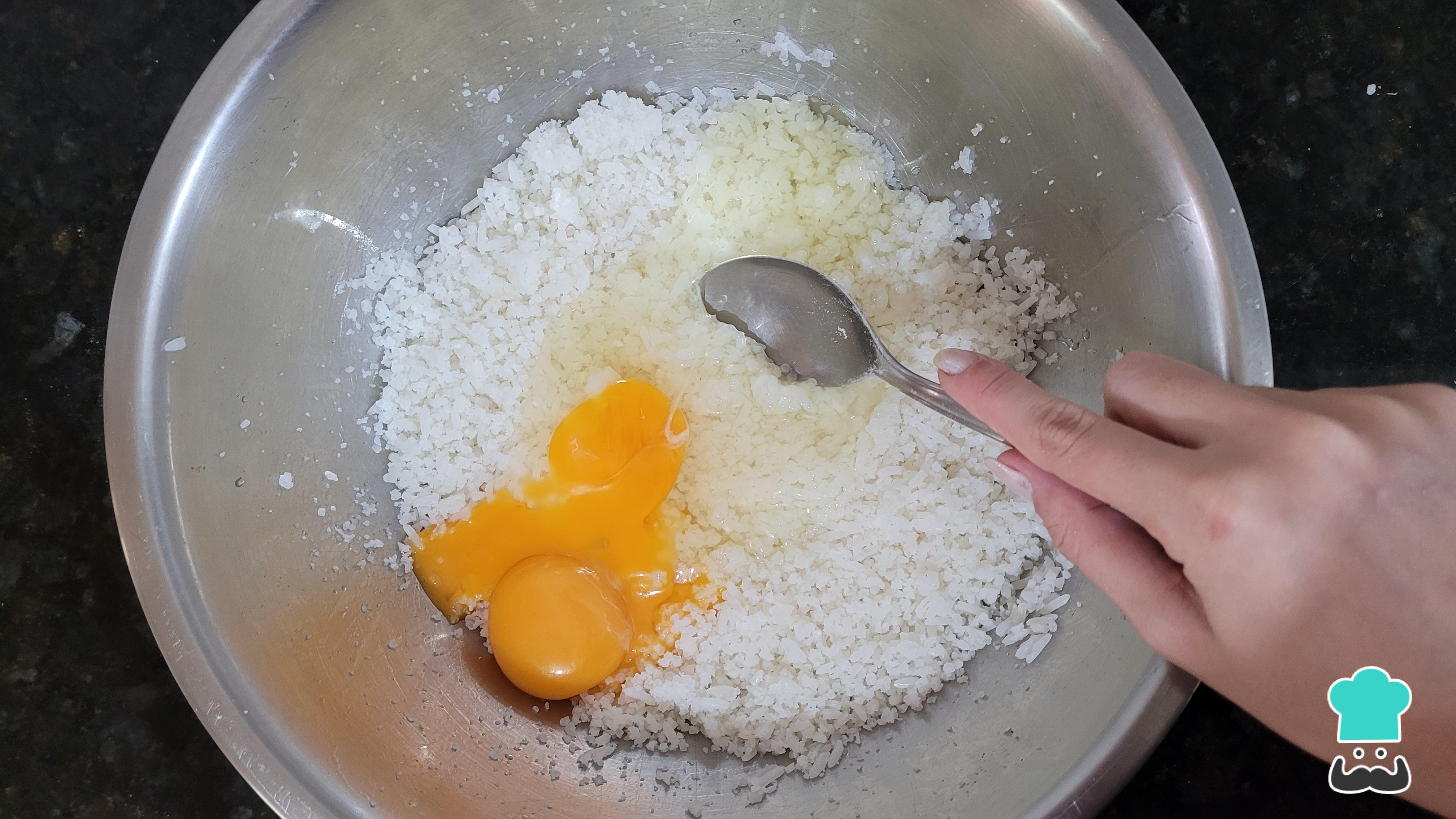O ovo ajudará a dar a liga no bolinho, é importante que ele pegue em todos os grãos.