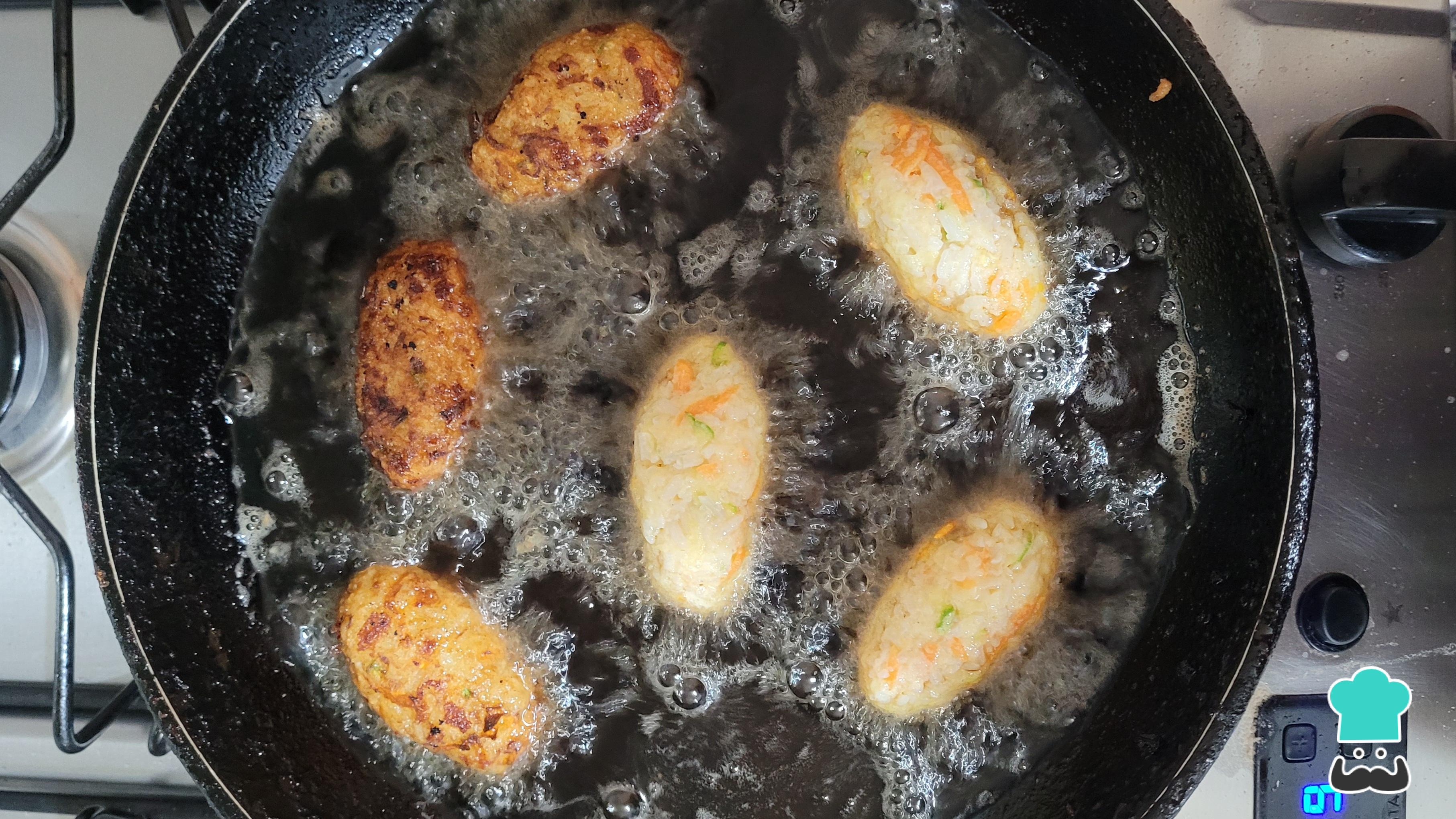 Esquente o óleo em uma frigideira e, quando estiver quente, coloque os bolinhos com cuidado.