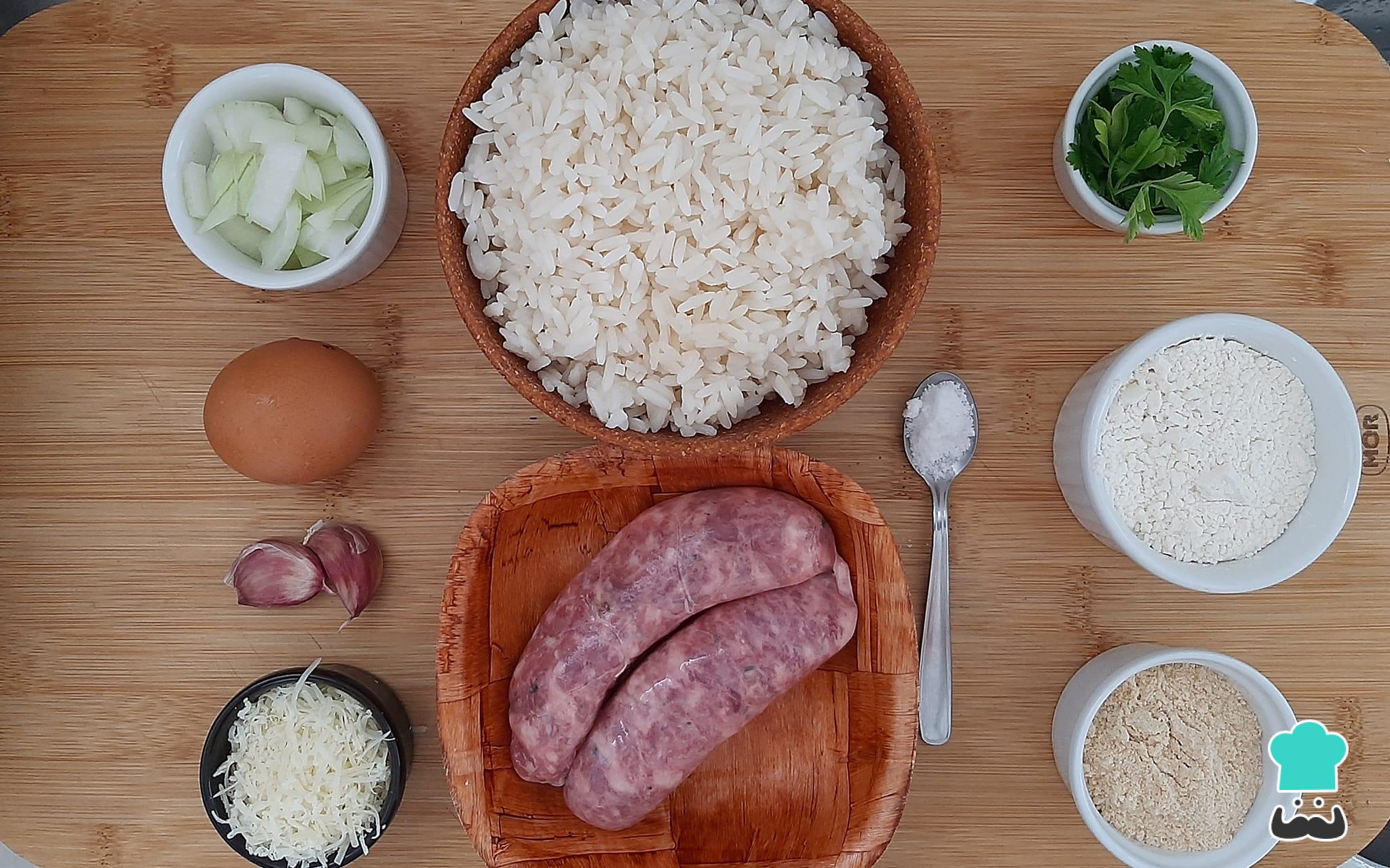 Comece separando todos os ingredientes necessários para preparar a receita de bolinho de arroz com linguiça.
