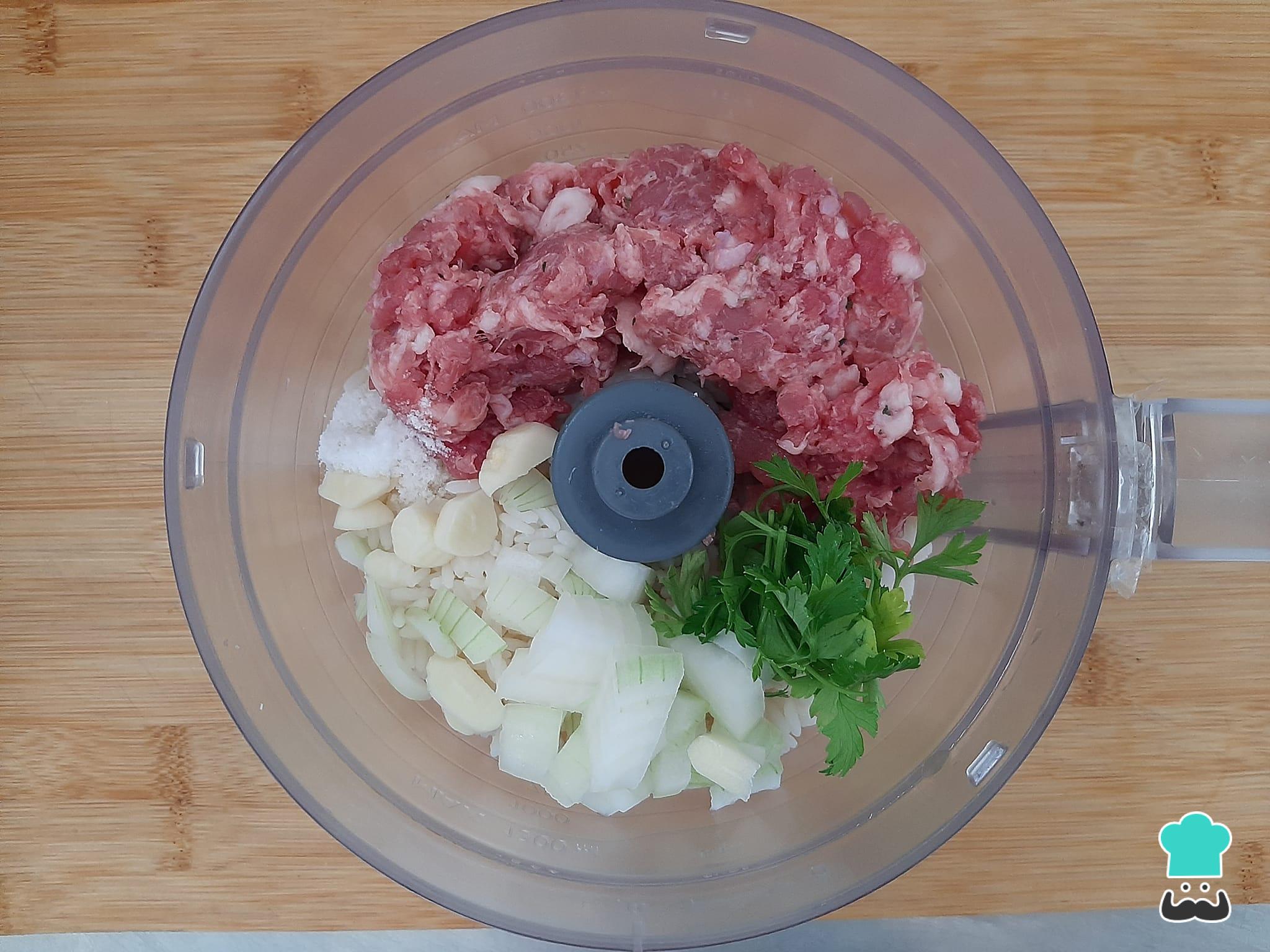No processador, triture a linguiça (sem a pele) com o arroz, a cebola, o alho e a salsinha até que fique bem processado.