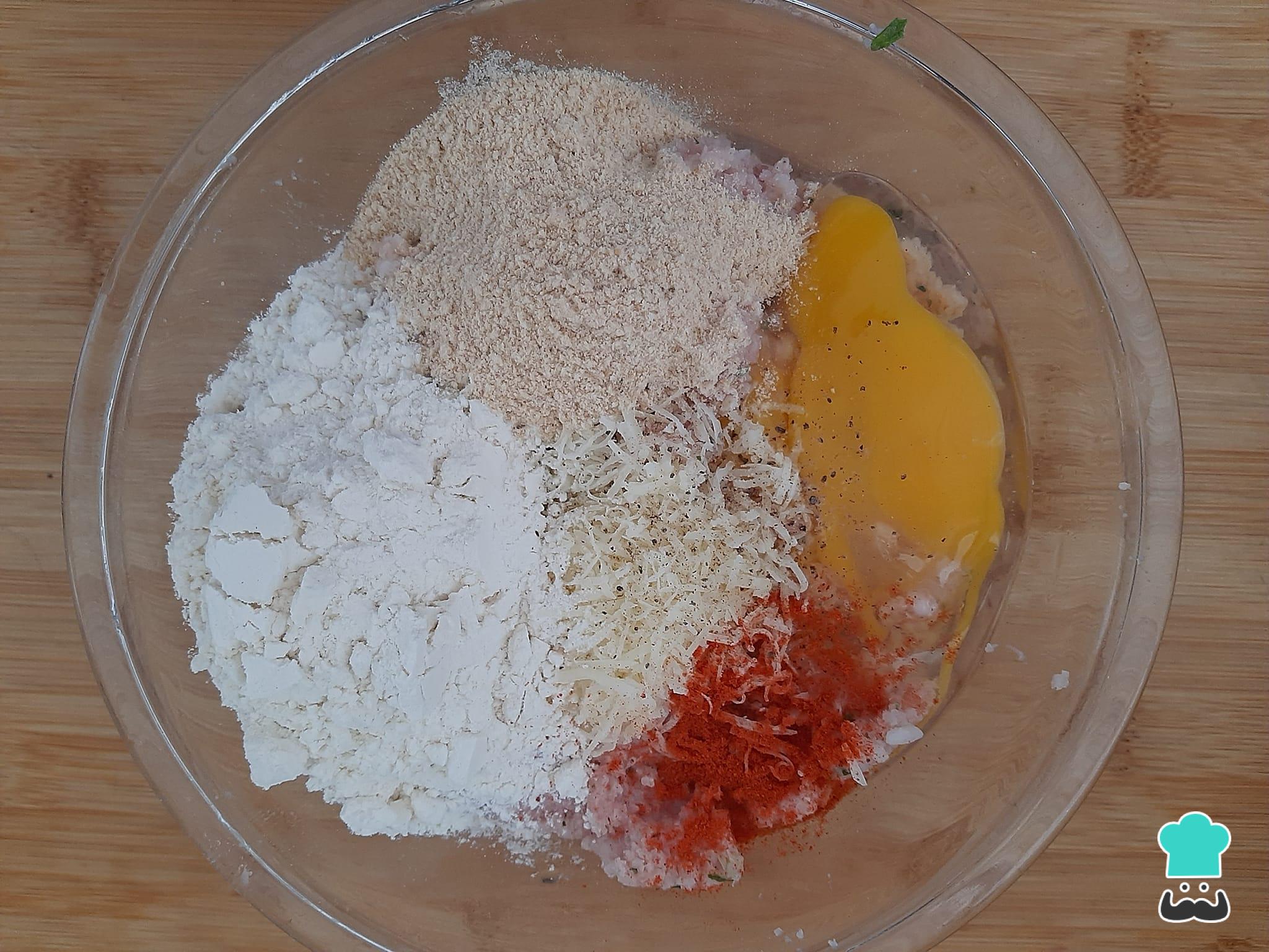 Passe a mistura para uma tigela e adicione o ovo, a farinha de trigo, a farinha de rosca, a páprica, o sal e a pimenta-do-reino, misturando bem até que a massa esteja fácil de ser modelada, porém ainda ficará levemente pegajosa.