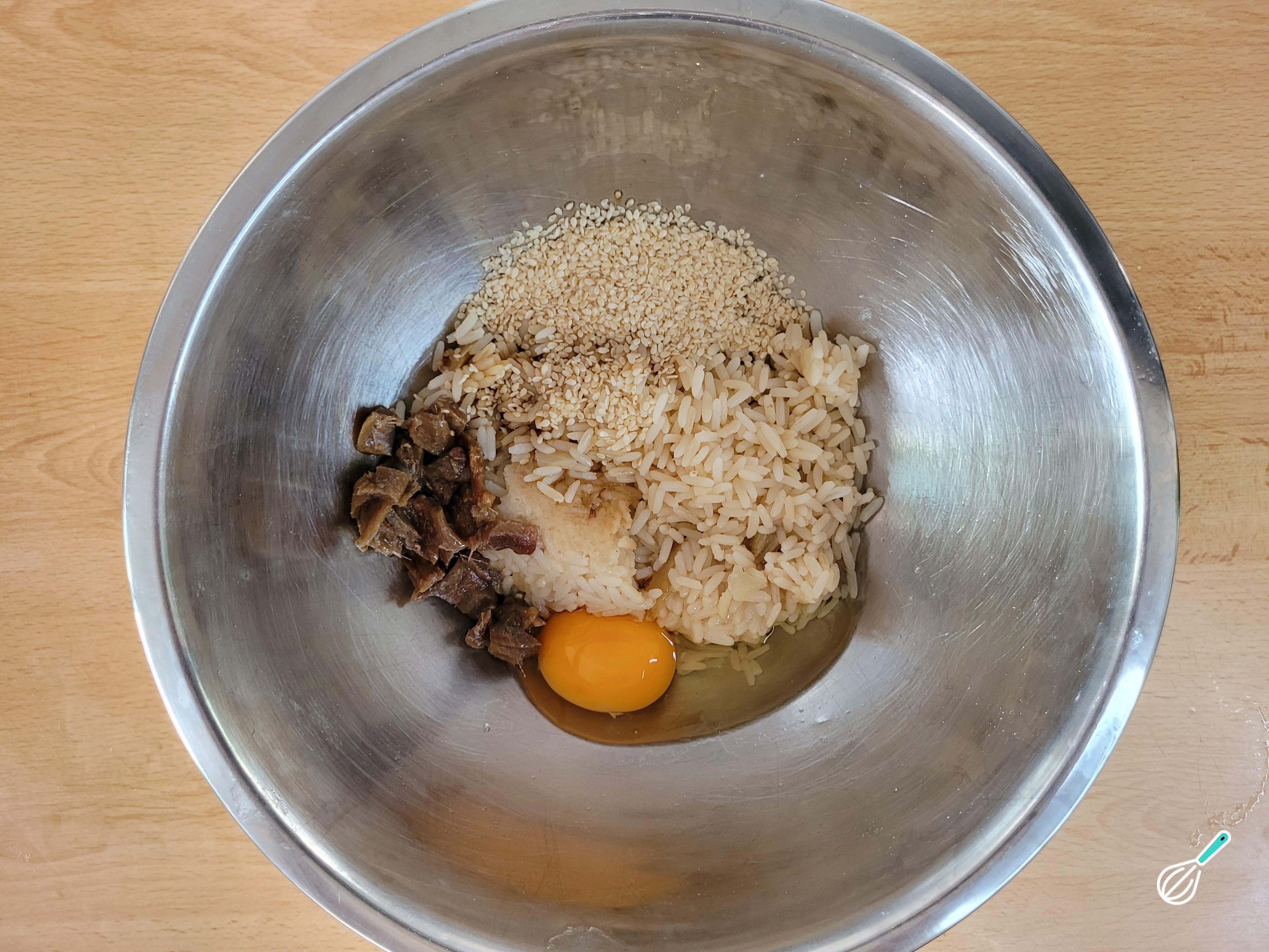 Adicione o arroz, o vinagre, o shoyu, o óleo de gergelim, o mel, as anchovas, o gergelim e o ovo em uma tigela. Misture bem.