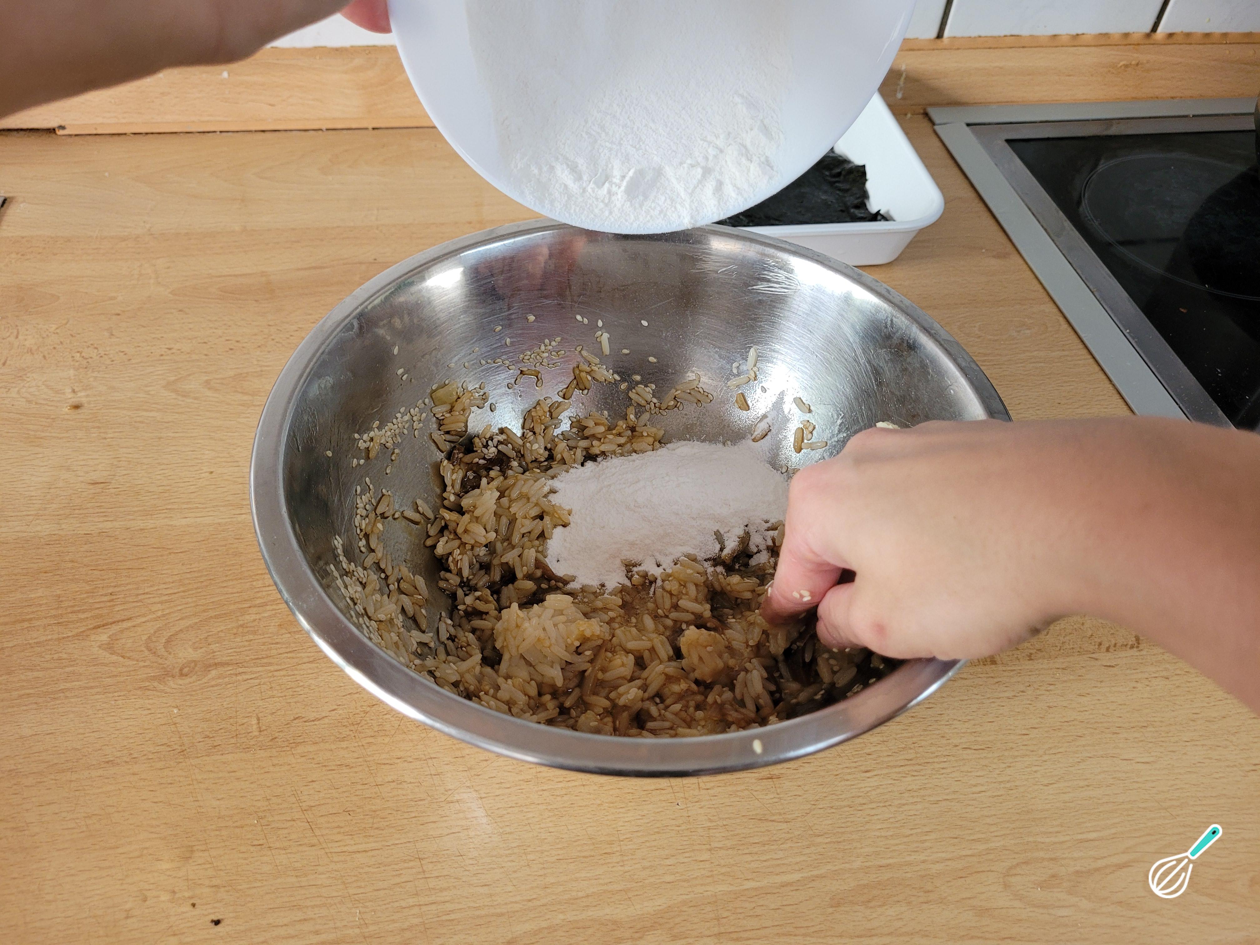 Comece a adicionar a farinha de arroz aos poucos e vá mexendo para incorporar. Adicione a farinha só até a massa parar de grudar nas mãos e você conseguir modelar bolinhas.