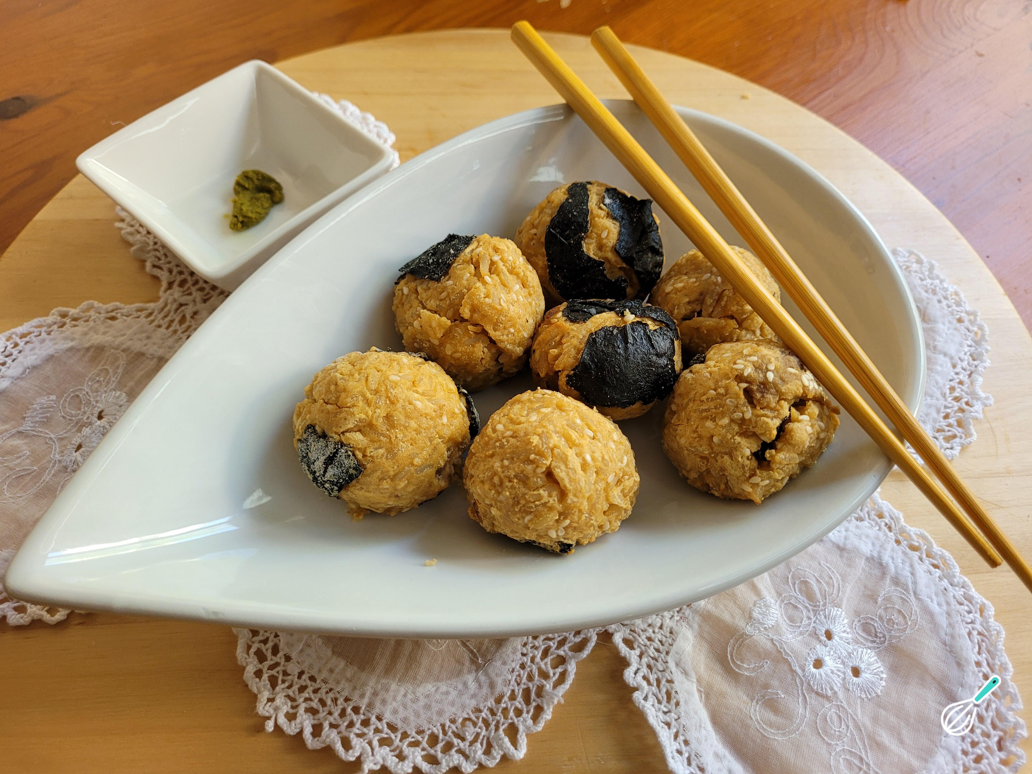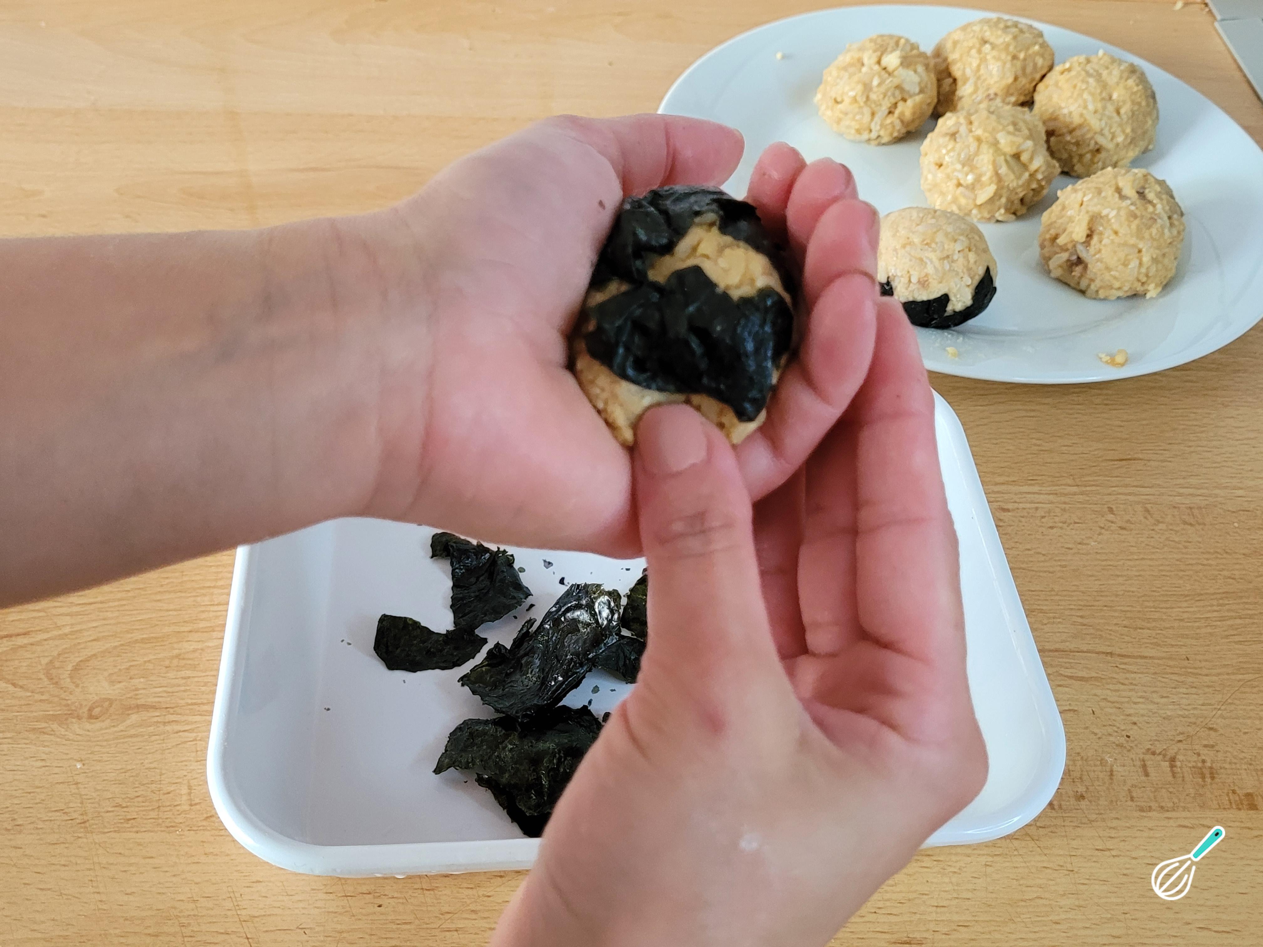 Modele as bolinhas do tamanho que quiser. Rasgue a folha de alga em pedaços menores e enrole as bolinhas pressionando um pouco pra grudar, se necessário.