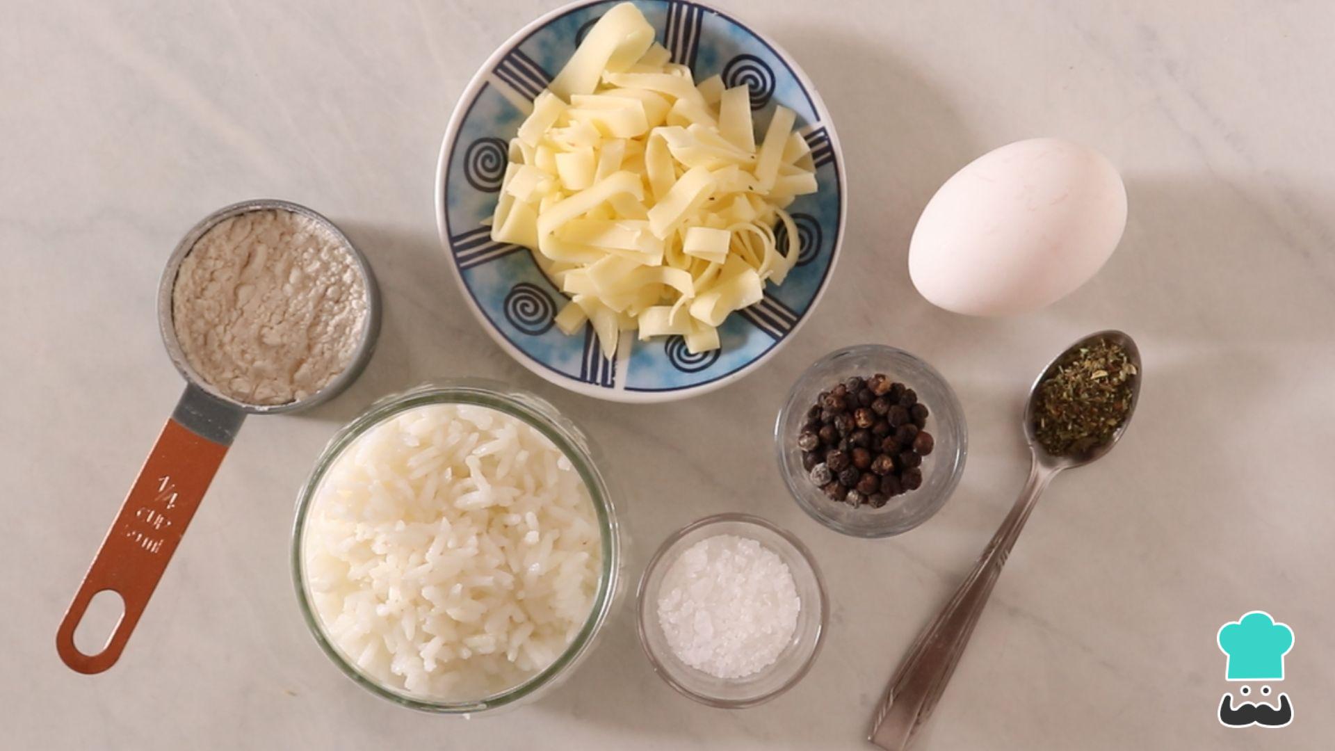 Separe os ingredientes para fazer o seu bolinho de arroz fit. Você fazer algumas substituições nessa receita, como usar arroz e farinha integral.