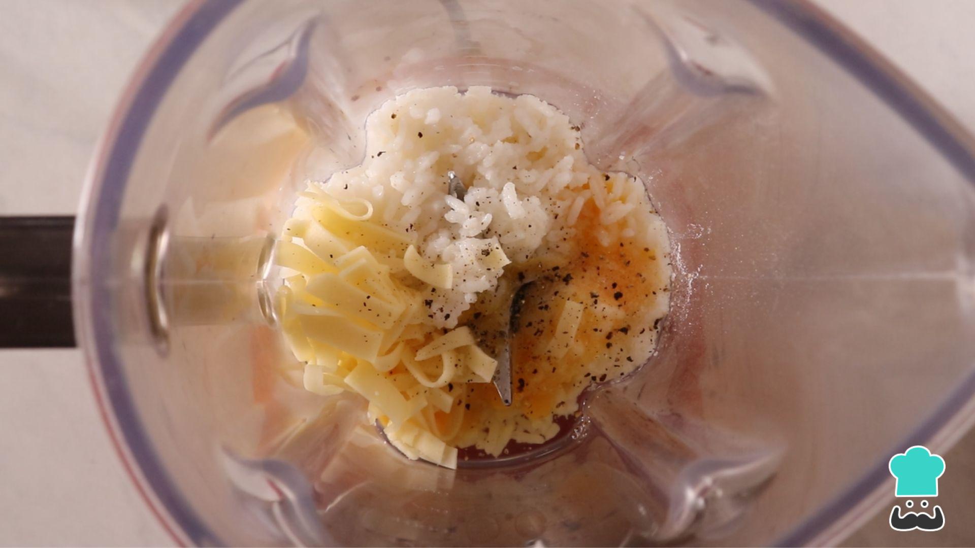 Bata no liquidificador o arroz, o ovo, o queijo, o orégano e sal e pimenta a gosto.