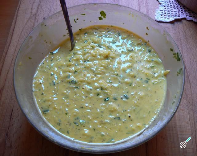 Preparar bolinho de arroz frito simples é bem fácil! Comece por misturar em uma tigela todos os ingredientes indicados, com exceção da farinha.