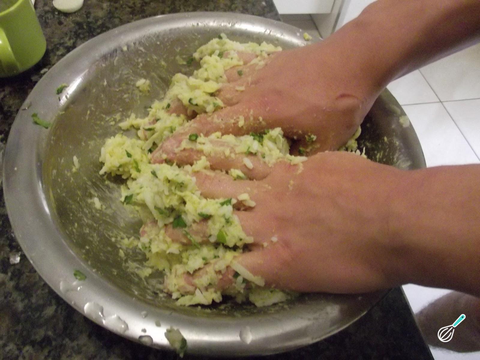 A mistura ficará meio líquida, e é aí que entra a farinha: acrescente a quantidade necessária enquanto mistura com as mãos, até obter o ponto de massa mole.