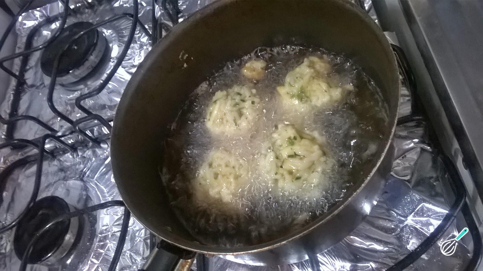 Separe porções pequenas da massa de bolinho de arroz frito simples e coloque fritando em óleo quente.