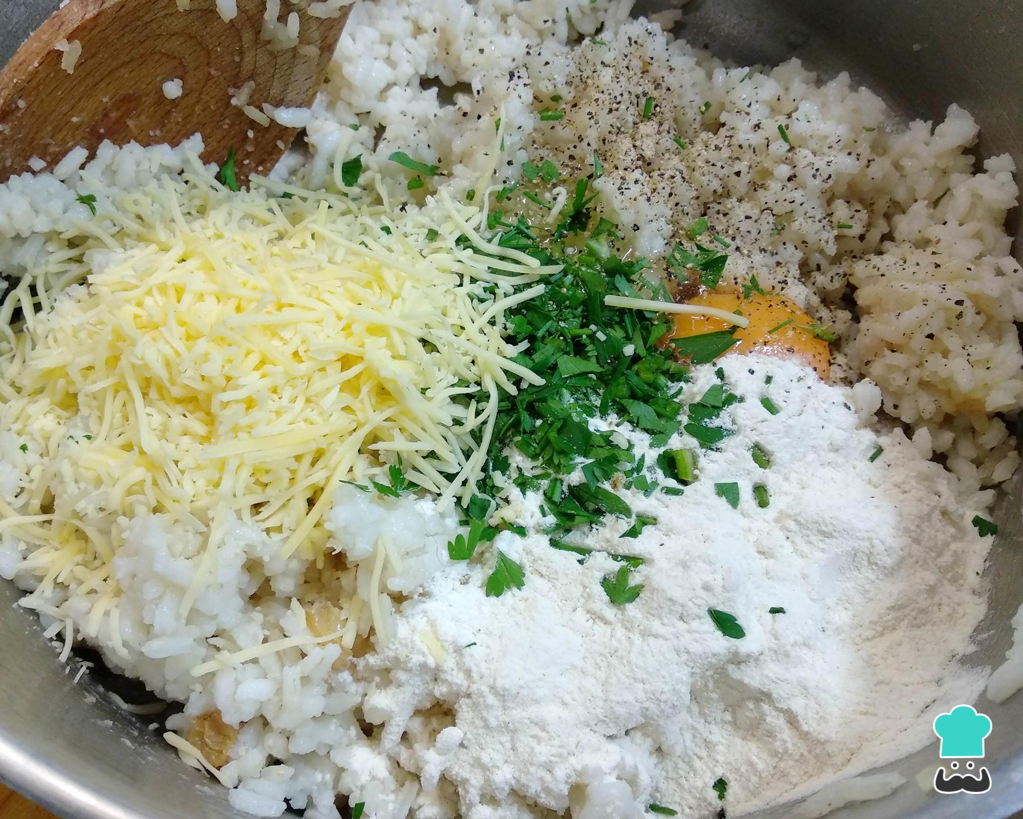 Neste caso eu queria um bolinho de arroz simples por isso adicionei somente sal, pimenta do reino, salsinha picada e queijo ralado. Outras opções são cebola, bacon, linguiça, azeitona e mais.