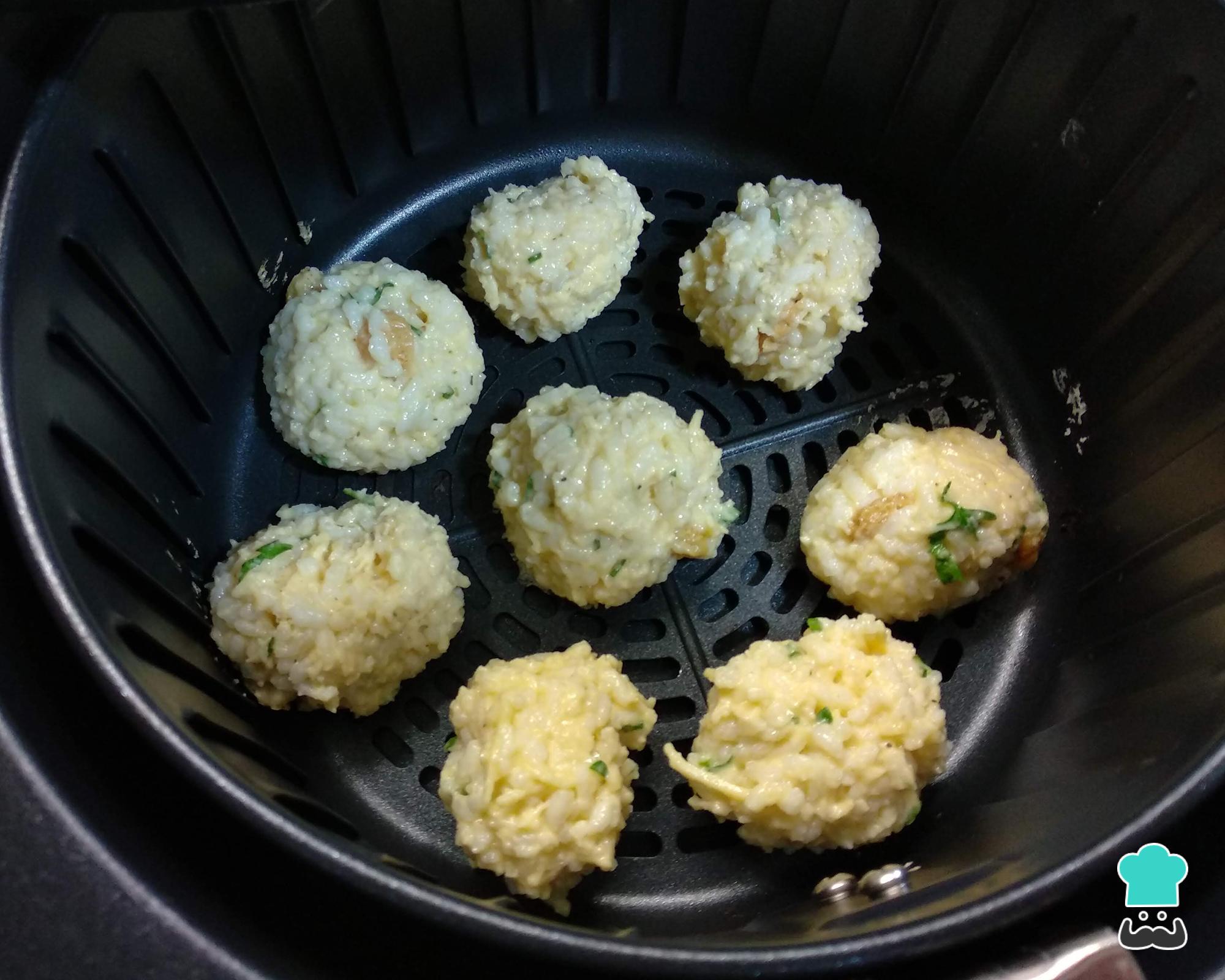Modele bolinhos de arroz com as mãos e coloque no cesto da AirFryer. Asse a 180ºC durante 10-15 minutos ou até os bolinhos ficarem douradinhos.