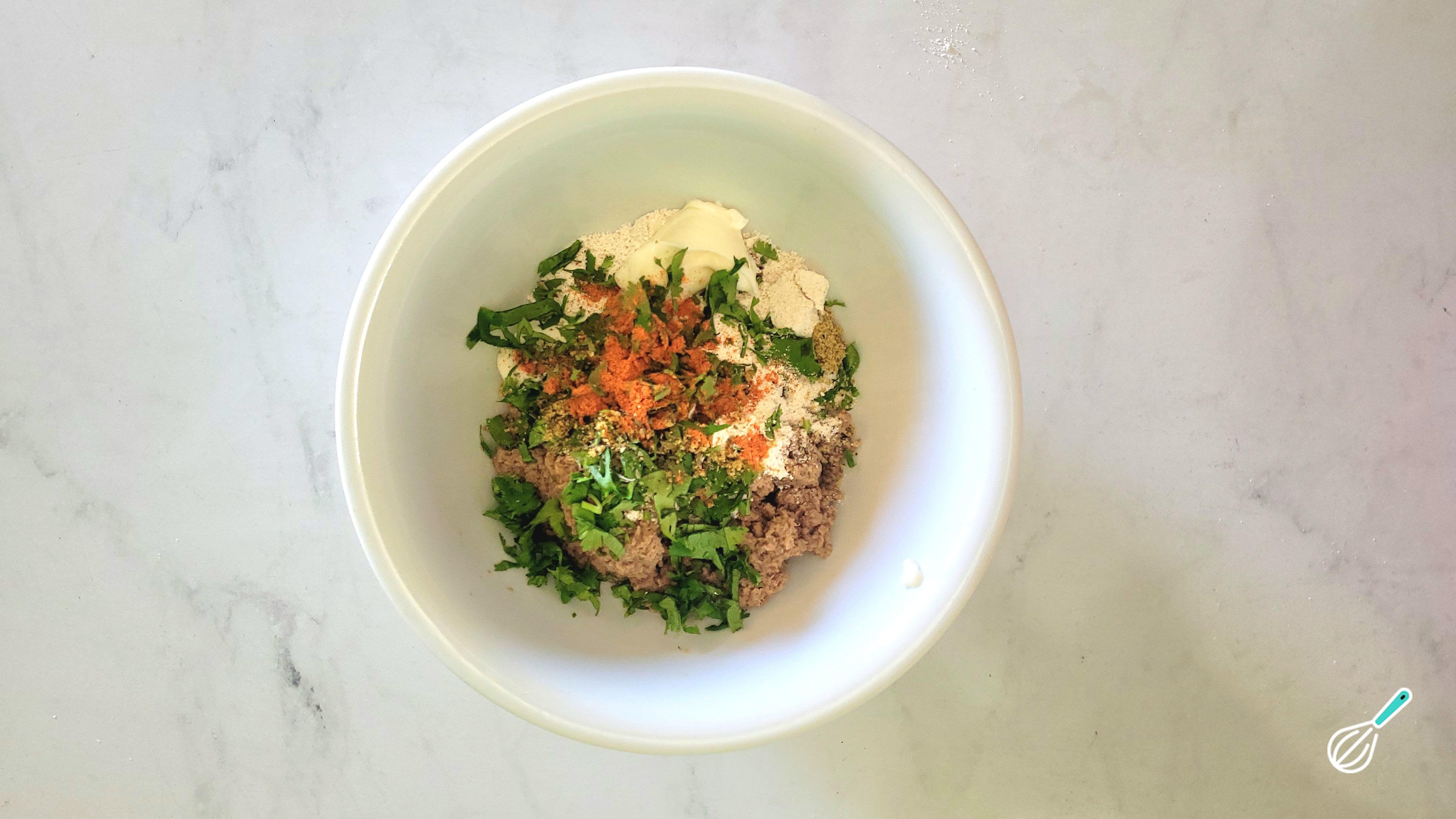 Em um recipiente, coloque o atum, a farinha de aveia, o requeijão, cheiro verde, páprica, lemon pepper e misture.