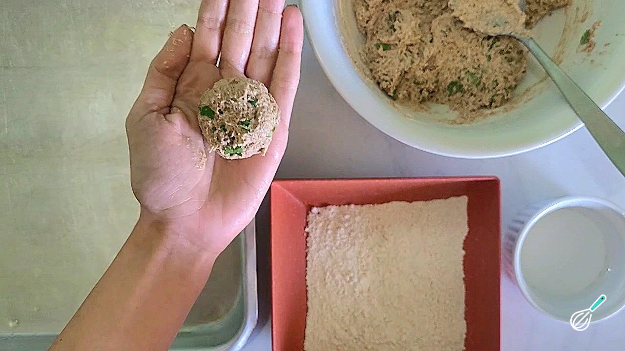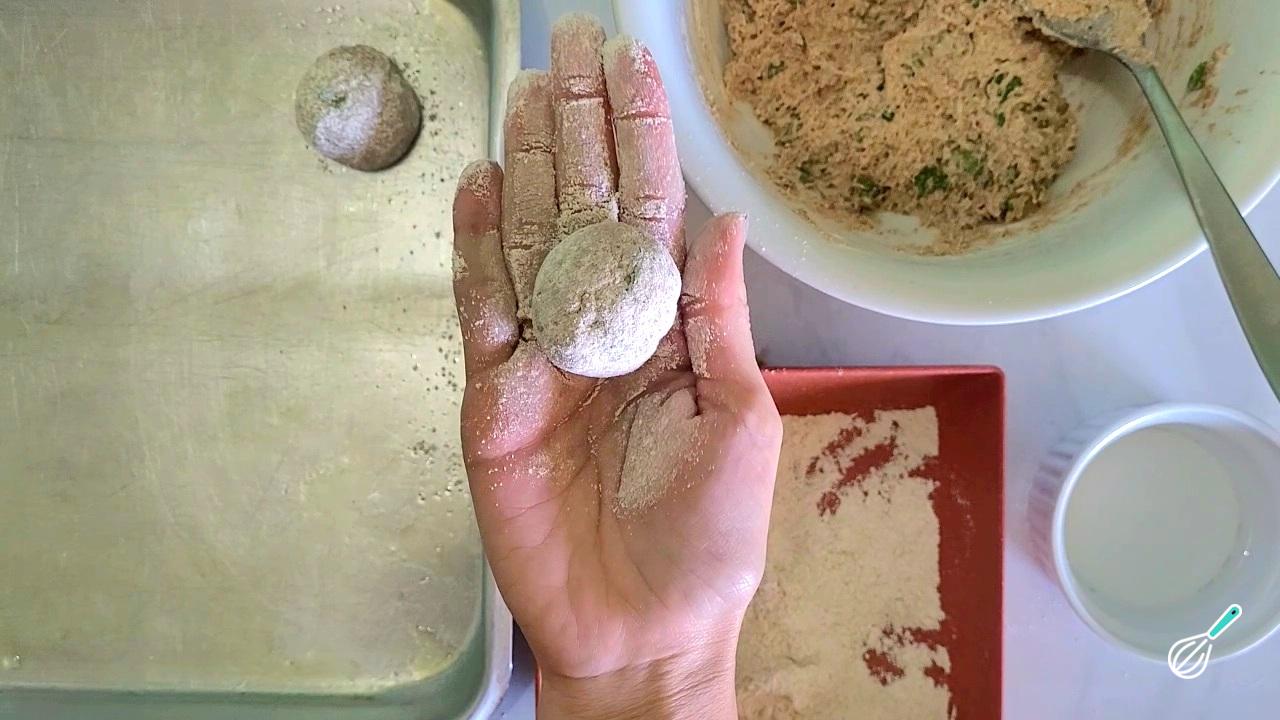 Em seguida, passe o bolinho na farinha de aveia para que ele fique mais crocante.
