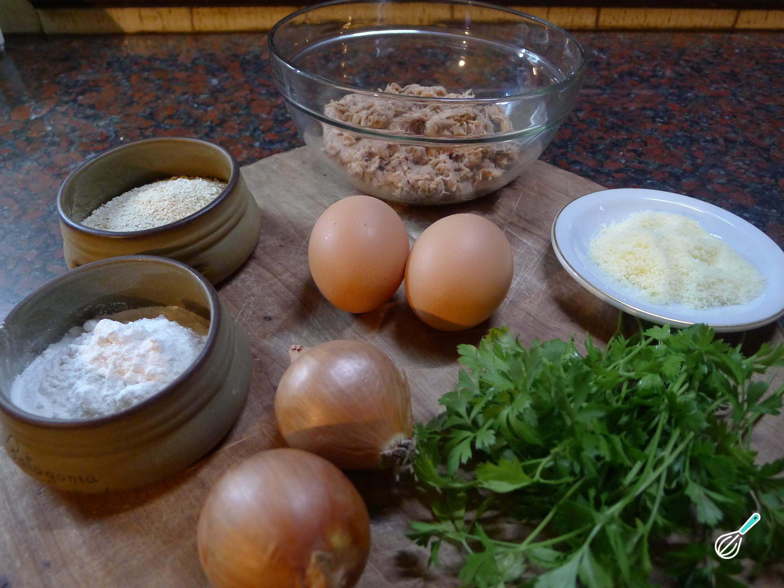 Primeiro prepare os ingredientes desta receita de bolinho de atum. As quantidades indicadas rendem cerca de 15 a 20 croquetes.