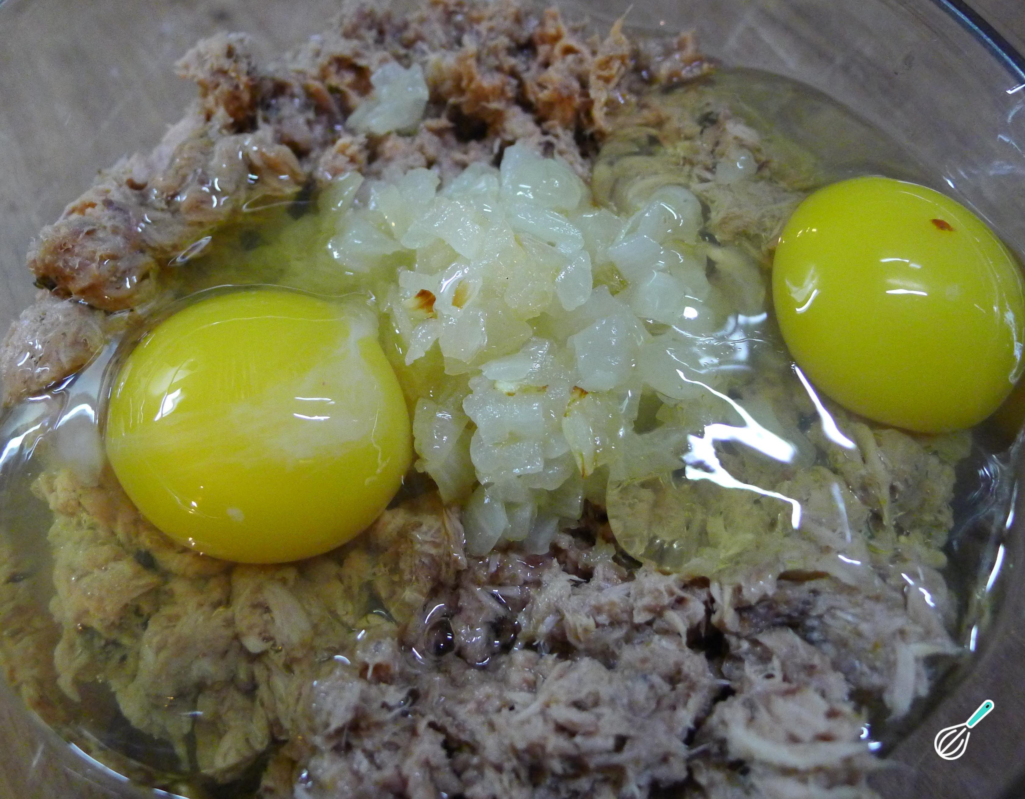 Numa tigela coloque o atum escorrido, acrescente a cebola refogada e os ovos.