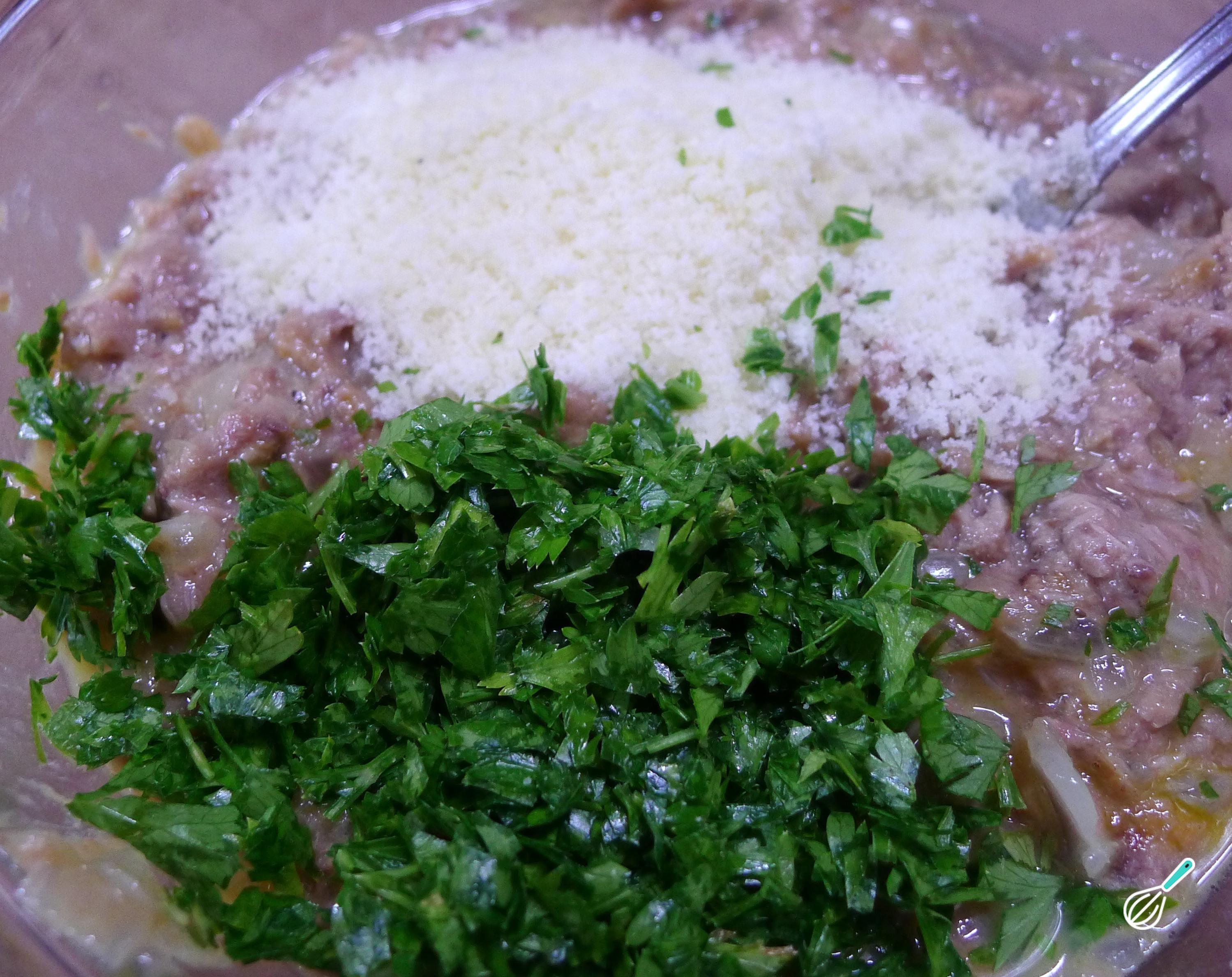 Pique finamente a salsinha e adicione à mistura anterior, juntocom o queijo ralado. Misture tudo bem.