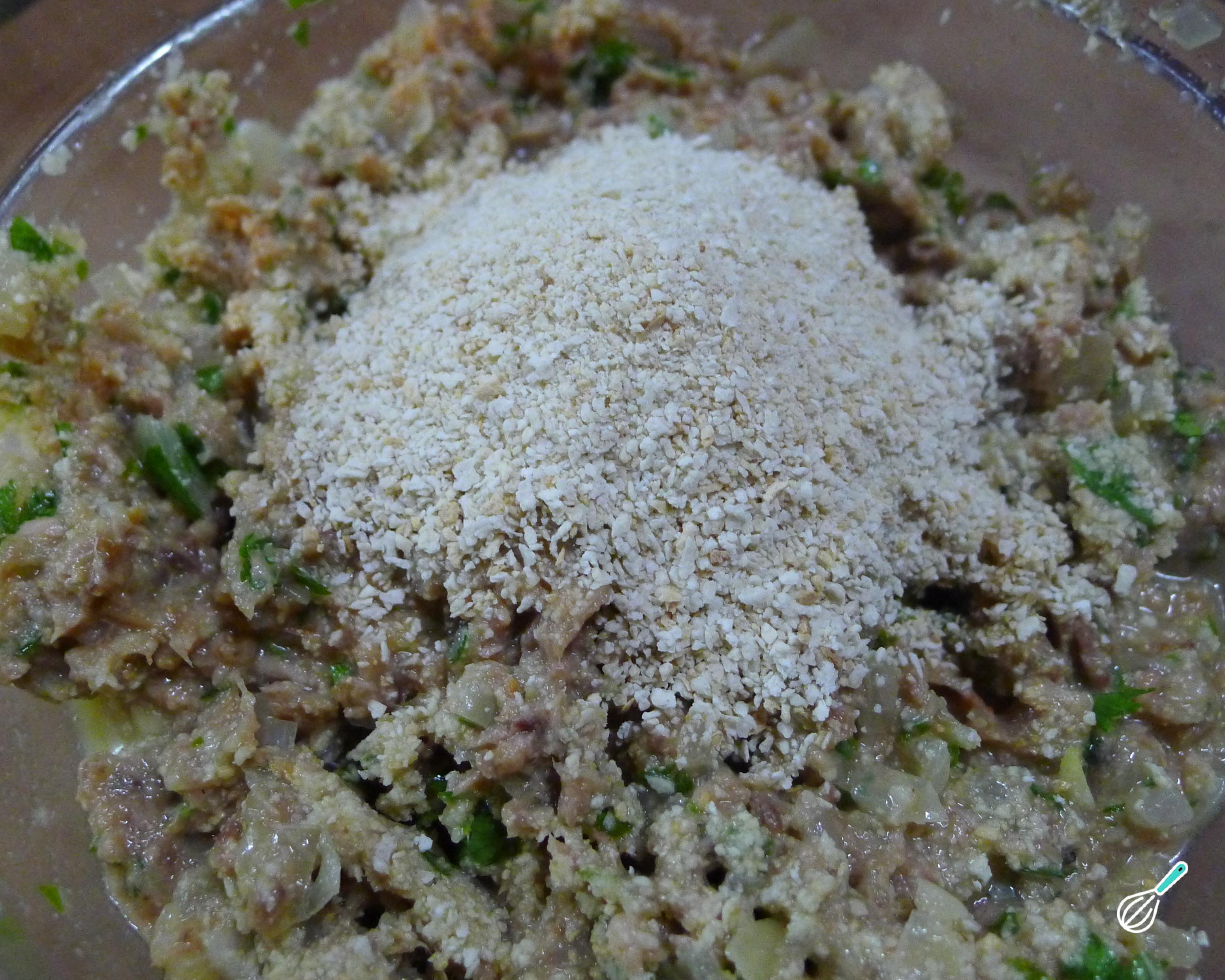 Junte agora uma colher de sopa de farinha de rosca e misture bem, para terminar a massa dos croquetes.
