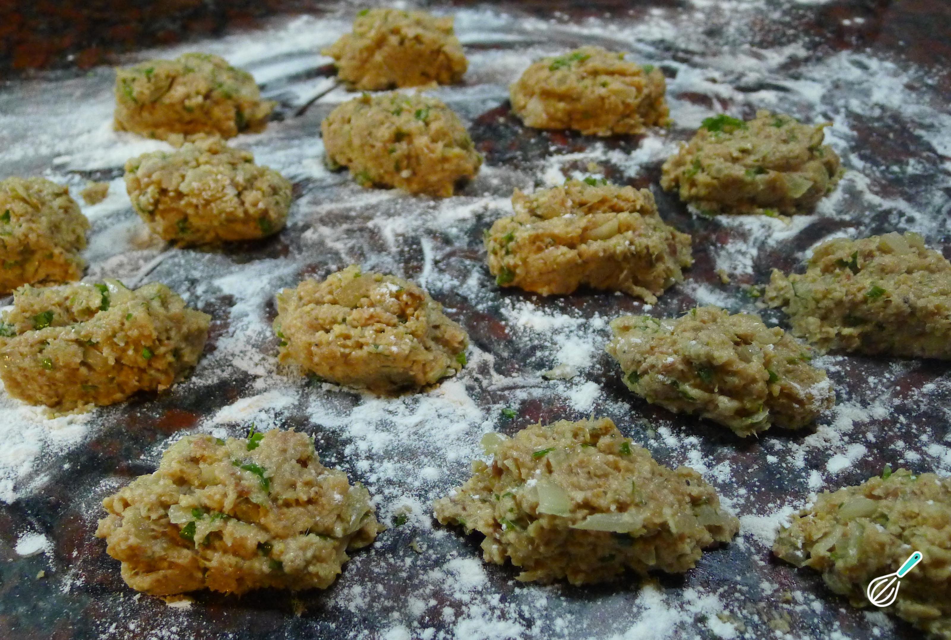 Modele os bolinhos de atum com a ajuda de um pouco de farinha. Pode fazê-los do tamanho e forma que preferir.